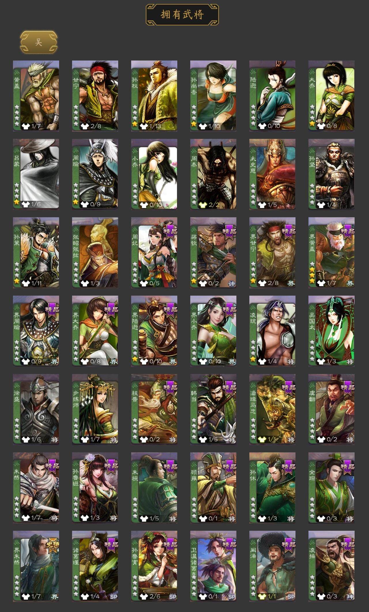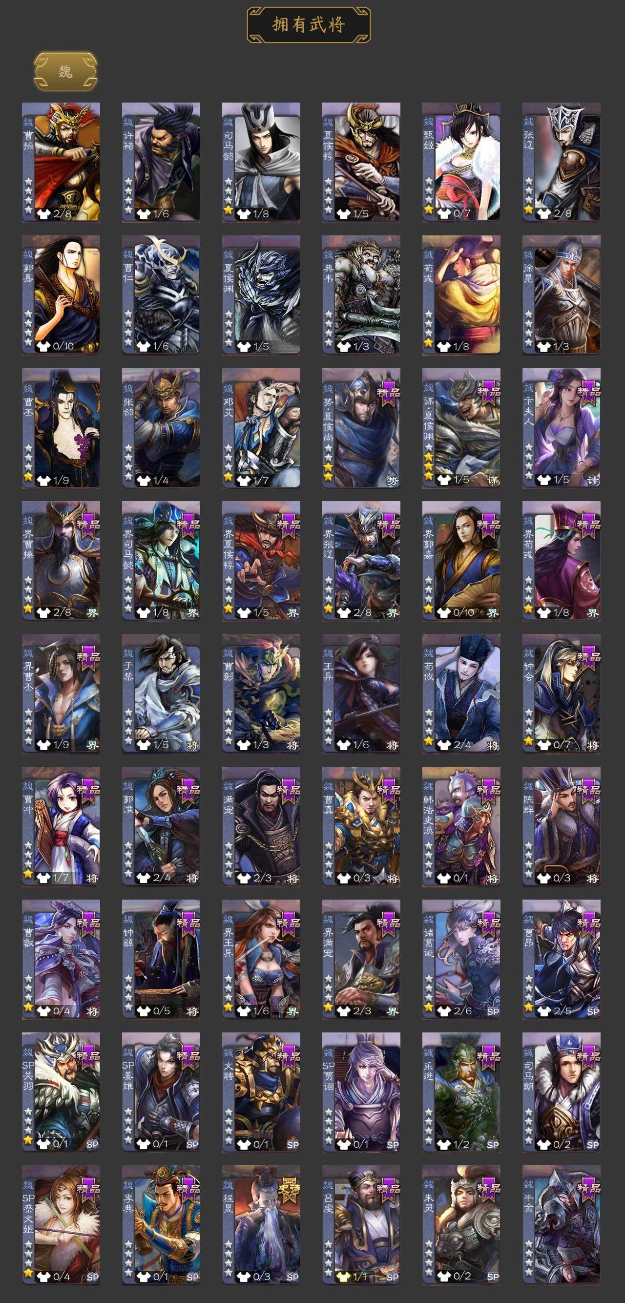 神刘备,神姜维,程昱,花鬘,界朱然,神吕蒙,势夏侯尚,SP关羽,SP蔡文姬,乐进,曹昂,诸葛诞,朱灵,文聘,SP姜维,钟会,曹冲,郭淮,满宠,界王异,界曹操,界司马懿,界夏侯惇,界张辽,界郭嘉,李典,曹真,韩浩史涣,陈群,曹叡,钟繇,司马朗,吕虔,界荀彧,