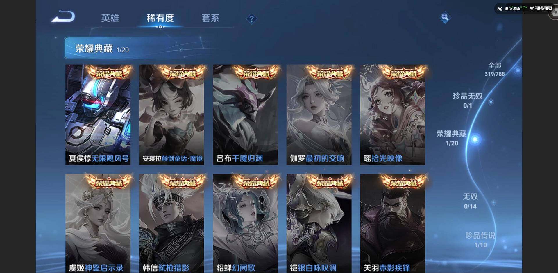 【小国标赵云 金标娜可露露 金标韩信 金标公孙离 金标橘右京 金标元歌 金标刘备 金标司马懿 金标孙尚香 金标狂铁 金标孙策】实名: 可修改 贵族等级: V7 英雄数: 128 皮肤数: 319 荣耀水晶: 无限飓风号 珍品传说: 酷洛米之心 星传说: 时之愿境,未来机甲,幽冥之眼,玉鸾吟 传说皮: 冠军飞将,久胜战神,炽阳神光,末日机甲-孙尚香,地狱火,地狱之眼,