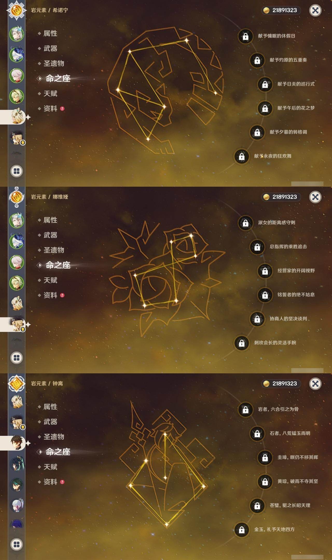 0命闲云,0命娜维娅,2命芙宁娜,1命那维莱特,0命流浪者,0命纳西妲,2命提纳里,0命夜兰,3命雷电将军,0命枫原万叶,0命神里绫华,0命钟离,1命胡桃,1命魈,1命达达利亚,0命刻晴,5命七七,1命琴,2命莫娜,0命迪卢克,0命基尼奇,0命希诺宁,0命玛薇卡,0命梦见月瑞希,0命杜林,精1裁断,精1静水流涌之辉,精1金流监督,精1万世流涌