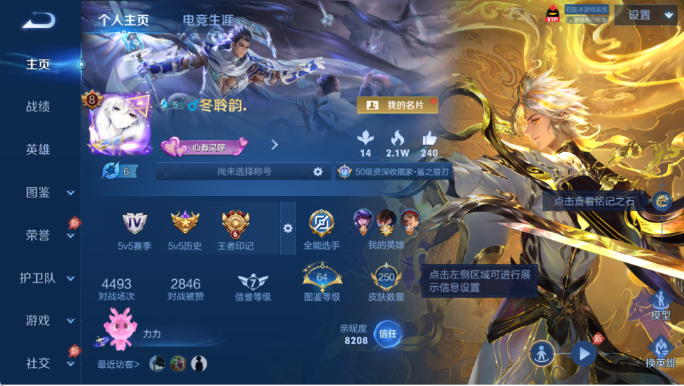 曜无双!韩信花木兰典藏!皮肤数量250印记总数6V8永恒钻石