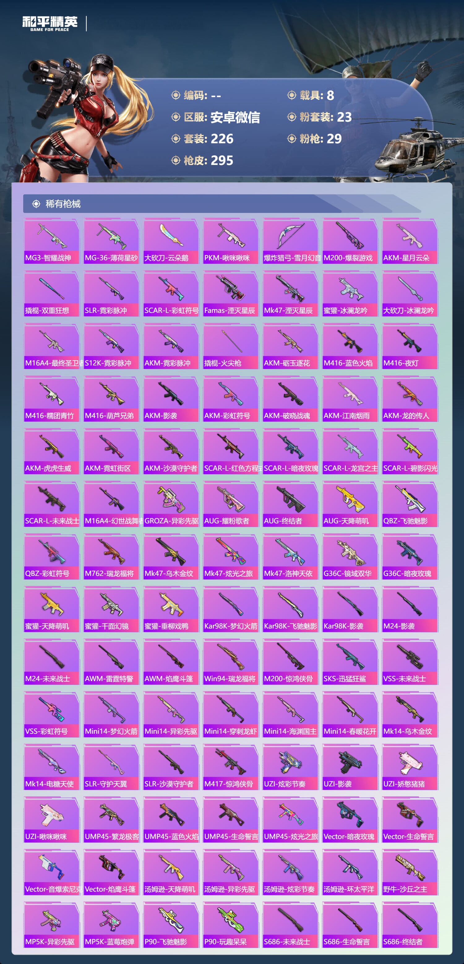 a4385/安卓微/14王牌印记-3红装-23粉装-29特效枪-8载具-139017热力值-226