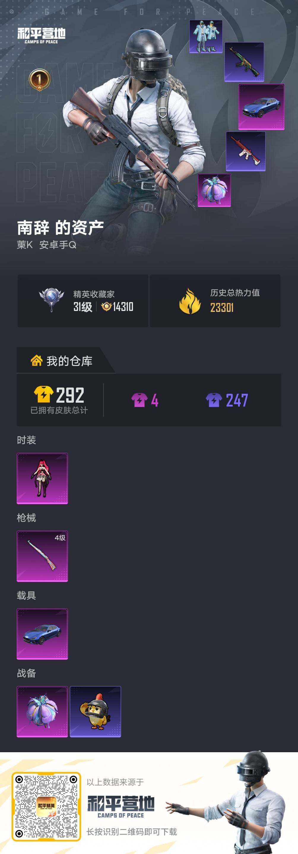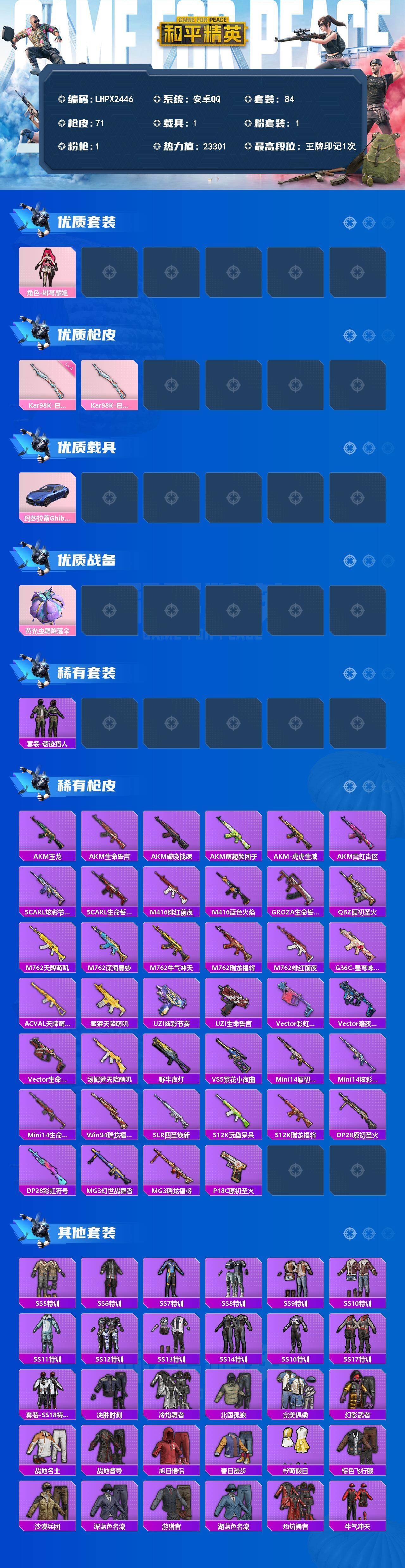 精品小号 可二次【特价出售/店主推荐】安卓 手Q-1粉装-1特效枪-1载具-23301热力值-1王牌印记-84套装-71枪皮【粉色套装】:角色-绯穹魔姬【粉色枪皮等级】:Kar98K-巳巳如意(四级)【粉色载具】:玛莎拉蒂Ghibli(蓝)