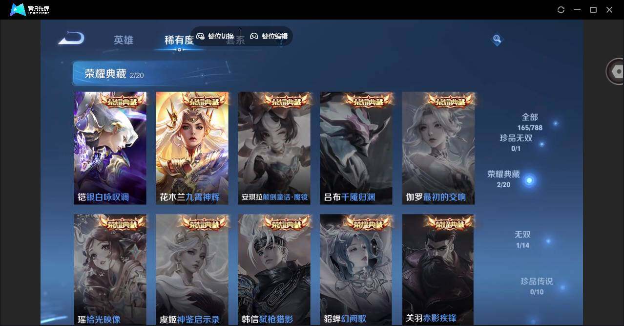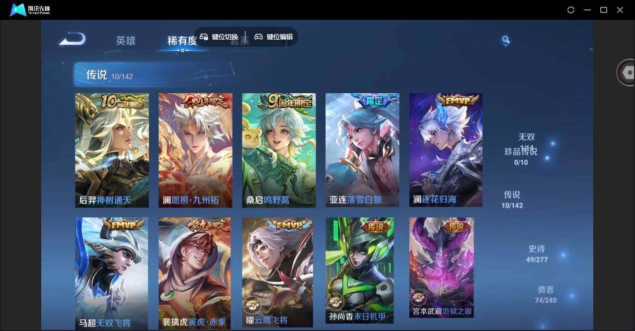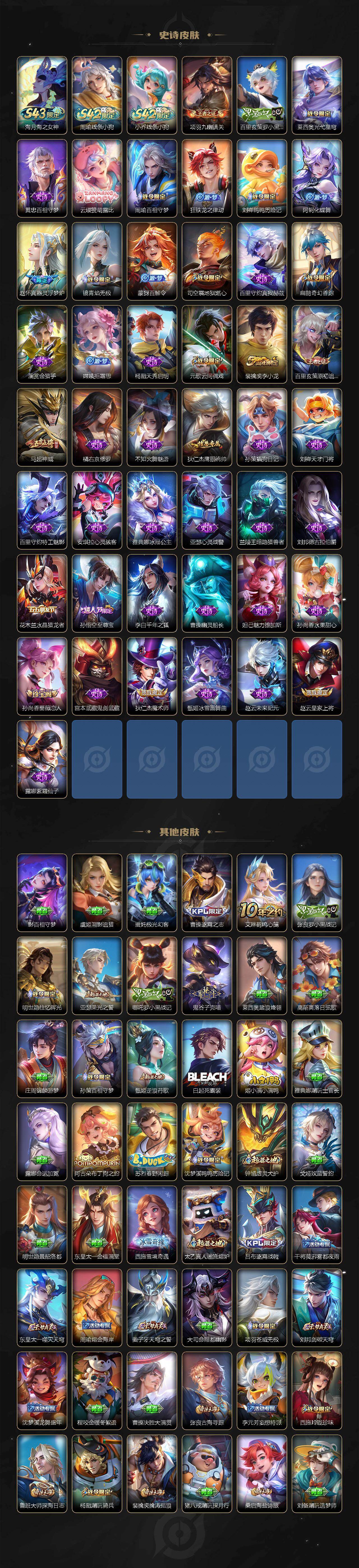 【传说皮肤】:后羿神树通天,澜愿照九州拓,桑启鸣野蒿,亚连落雪白狼,澜逐花归海,马超无双飞将,裴擒虎寅虎赤拳,曜云鹰飞将,孙尚香末日机甲,宫