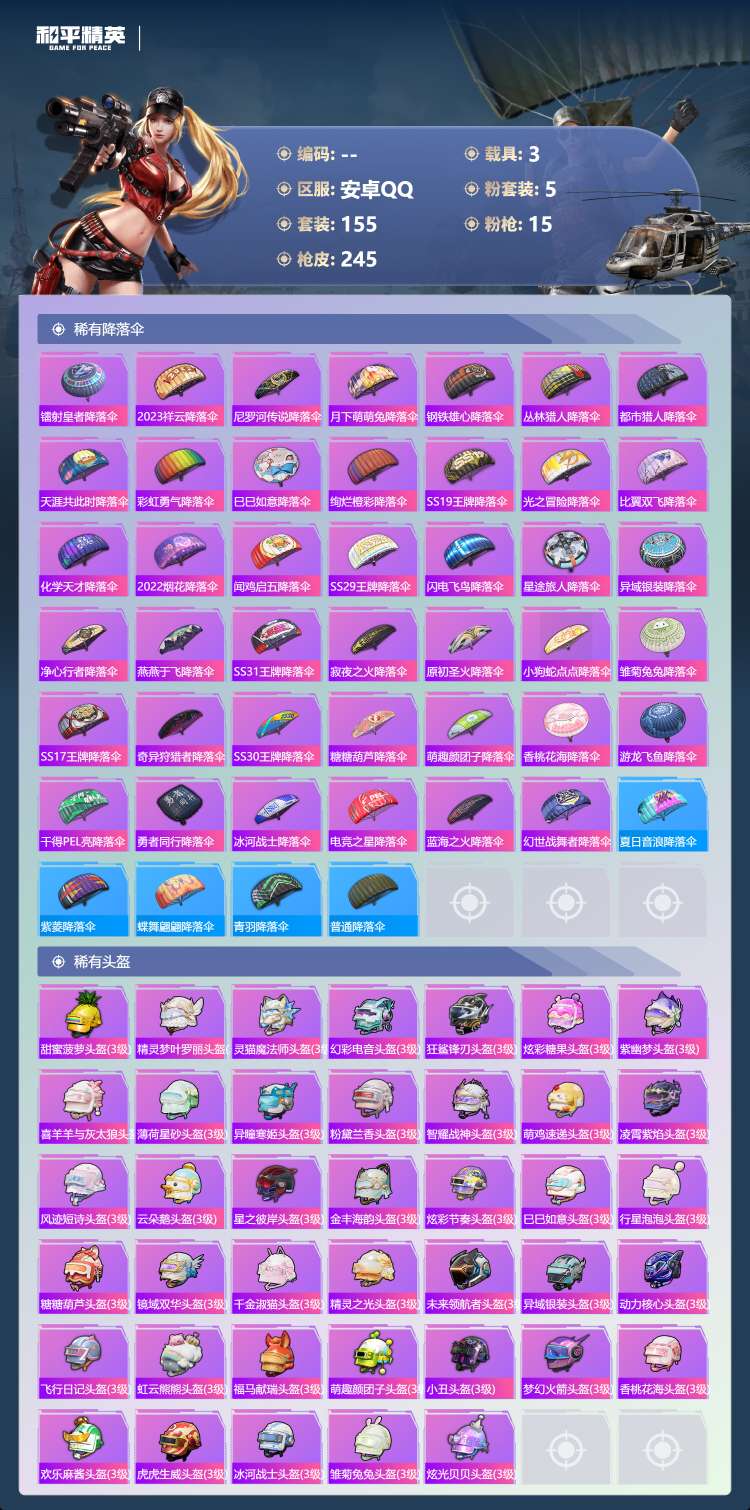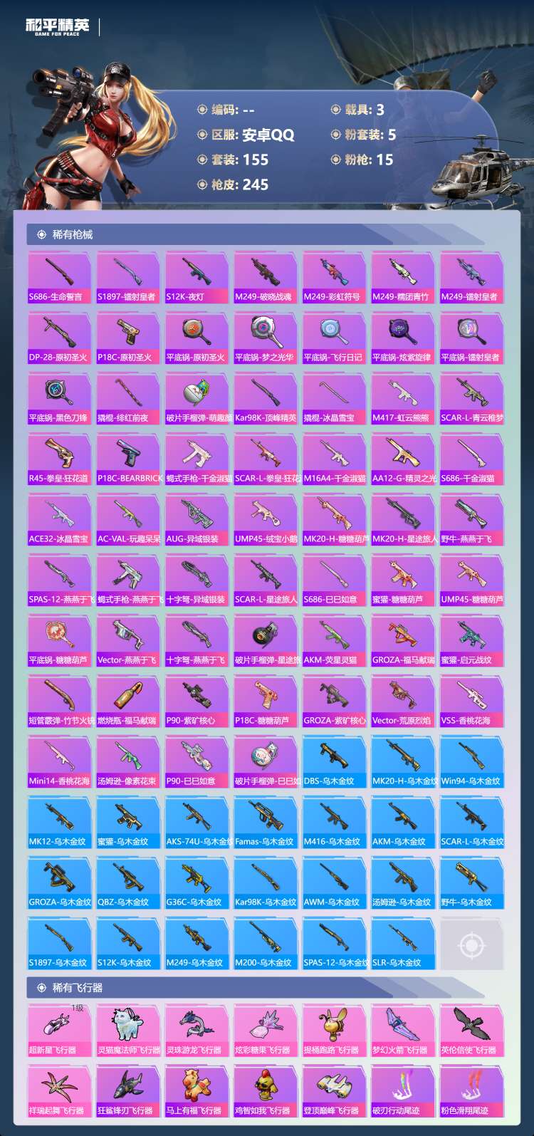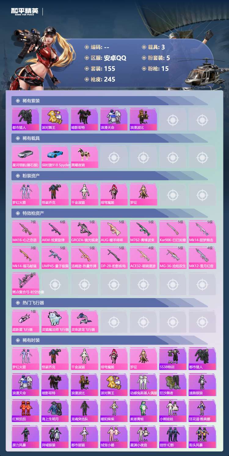 hs70234 安卓手Q-12王牌印记-5粉装-15特效枪-3载具-79195热力值-155套装-2