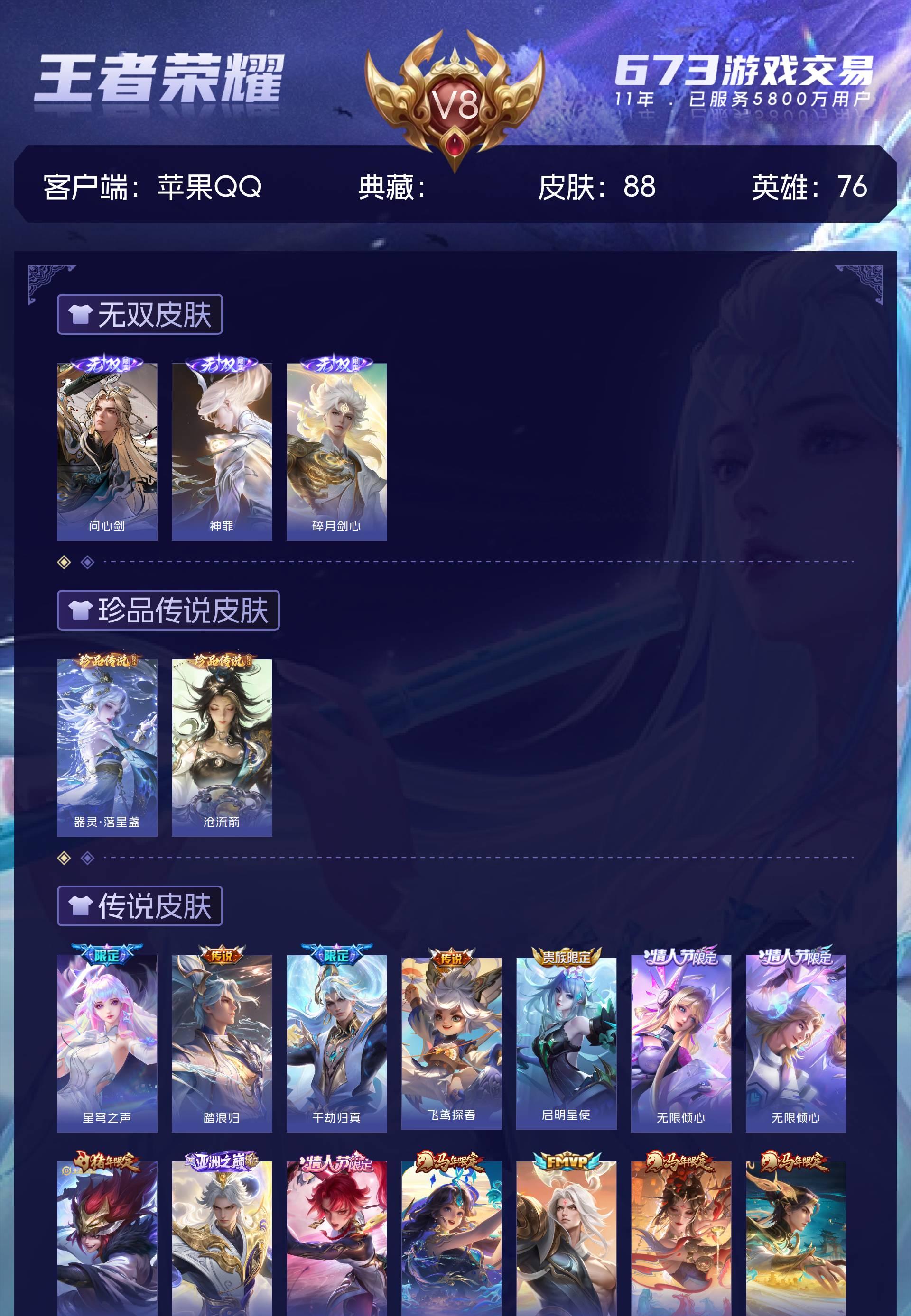 V8 皮肤88 英雄76 永恒钻石 无双皮肤3 珍品传说2 传说20