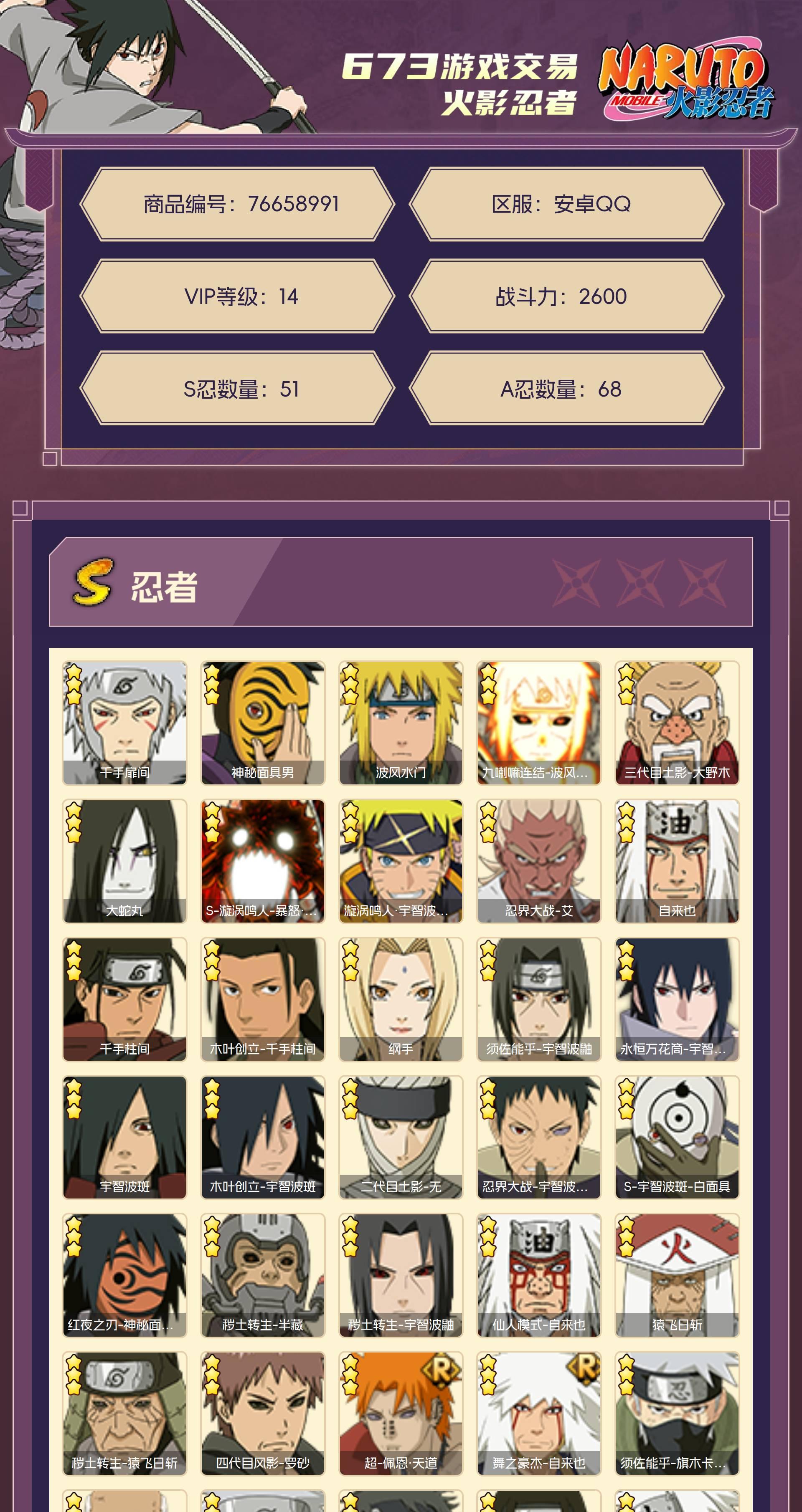 角色等级163 金币1.4w 战斗力2600 S忍51 A忍68 5星S忍者2 14 段位影级
