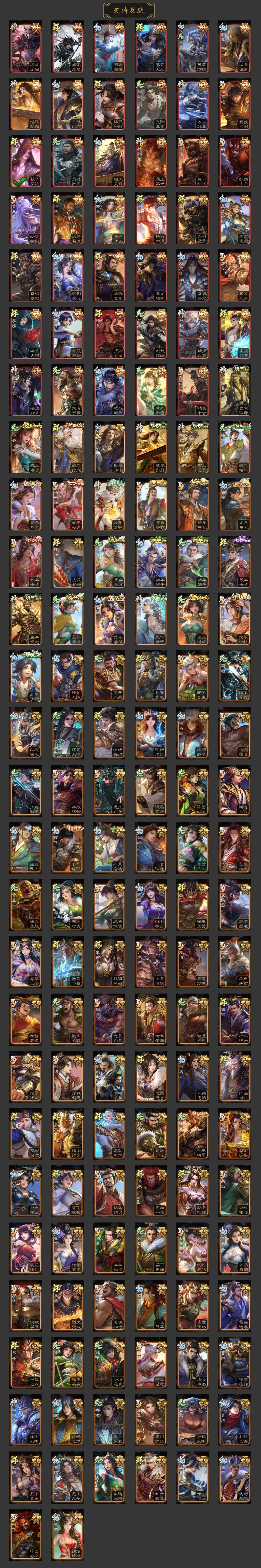 神吕布,神赵云,神司马懿,神甘宁,神张辽,神郭嘉,神孙策,曹髦,星周不疑,王粲,杨修,王元姬,界钟会,嵇康,郝昭,陈琳,曹婴,曹纯,戏志才,谋夏侯惇,清河公主,程昱,关索,马云騄,谋赵云,诸葛瞻,赵襄,张星彩,沙摩柯,谯周,界黄忠,花鬘,董允,谋关