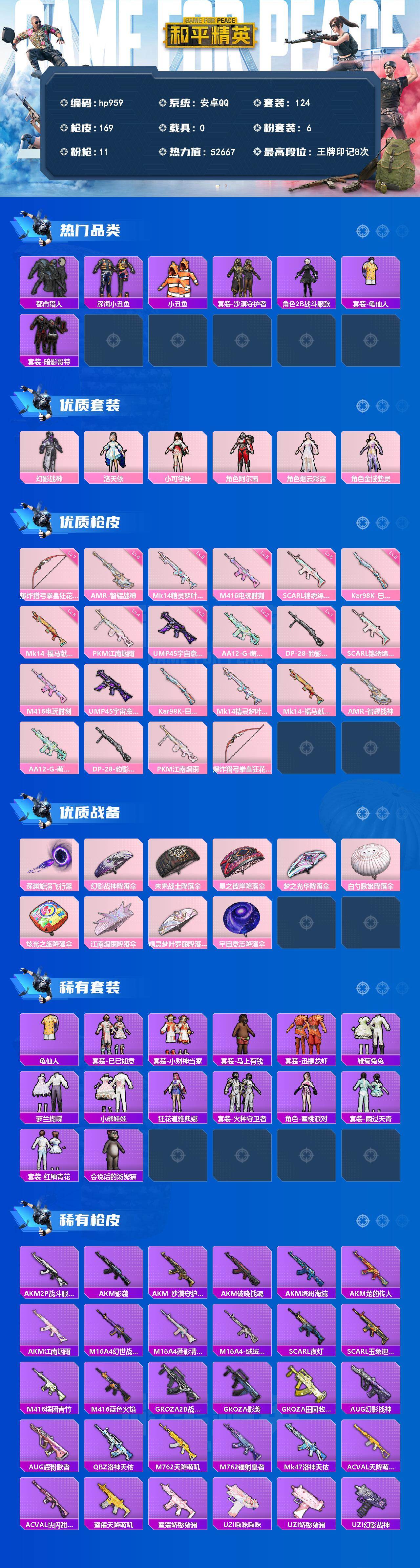 安卓 手Q-6粉装-11特效枪-0载具-1粉色飞行器-52667热力值-8王牌印记-124套装-169枪皮