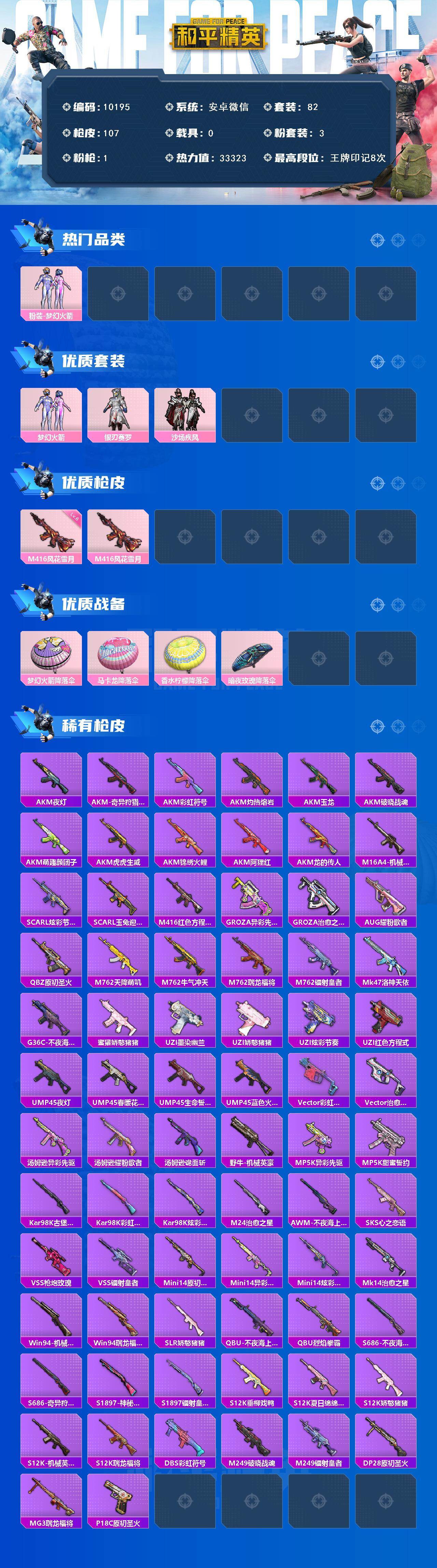 安卓 微信-3粉装-1特效枪-0载具-0粉色飞行器-33323热力值-8王牌印记-82套装-107枪皮