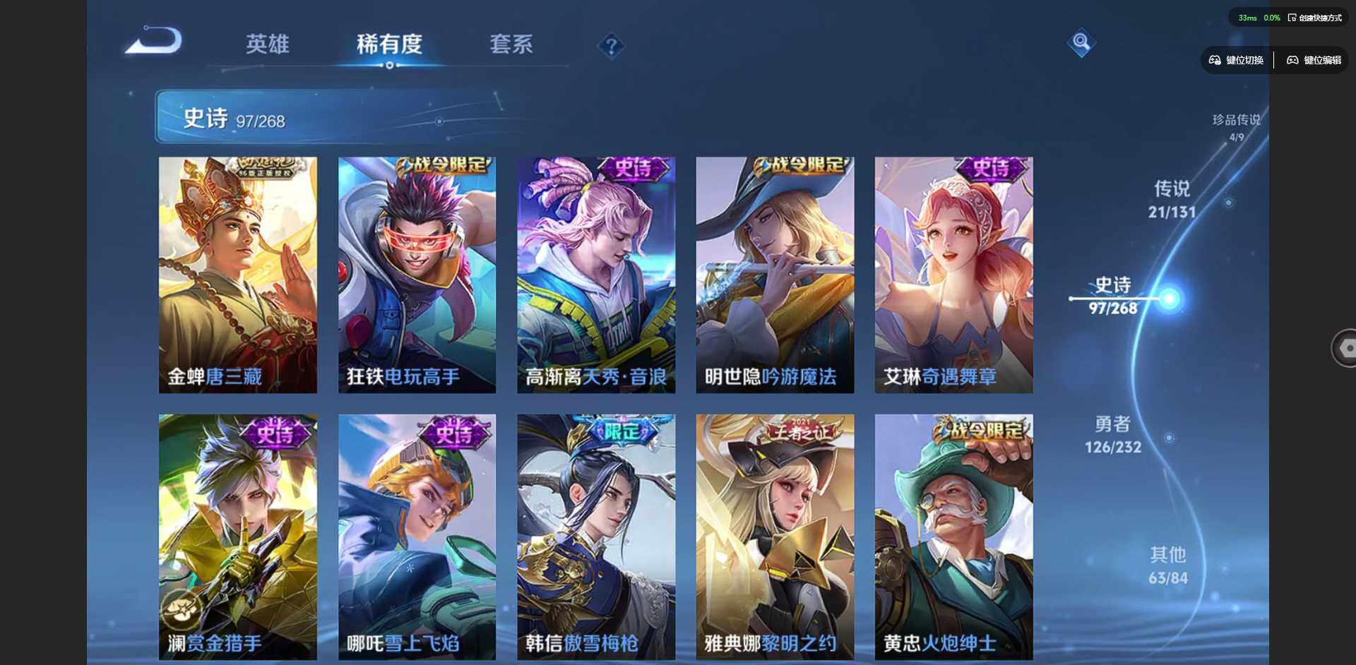 贵族等级: V8 英雄数: 127 皮肤数: 313 荣耀水晶: 弑枪猎影,最初的交响 珍品传说: 怪盗基德,器灵·落星盏,兔狲·蓬尾,朽木白哉 星传说: 幽冥之眼 传说皮: 黄金射手座,云鹰飞将,黄金白羊座,猫影幻舞,炽阳神光,一念神魔,地狱之眼,飞鸢探春,音你心动-周瑜,胖达荣荣,时之恋人-刘备