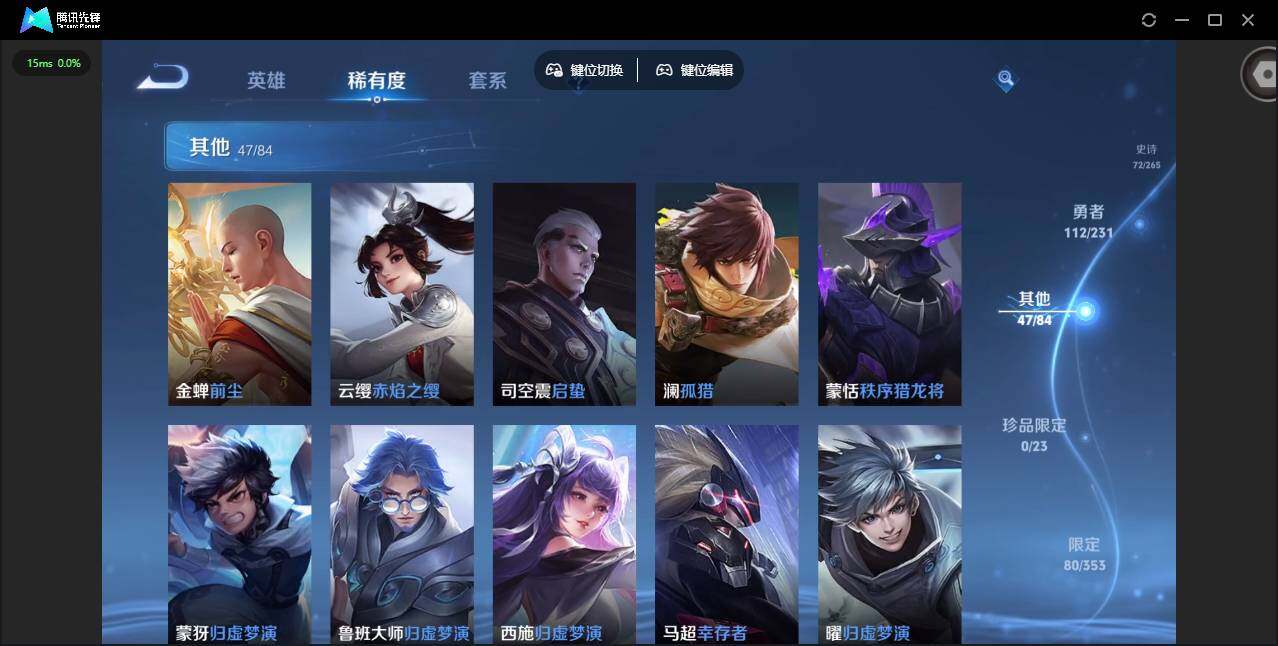 实名: 可修改 贵族等级: V7 英雄数: 124 皮肤数: 245 星传说: 零号·雷霆 传说皮: 冠军飞将,一念神魔,零号·赤焰,游龙清影,淬星耀世,山海·炽霜斩,山海·琳琅生,山海·苍雷引,永恒水手月亮,幻光神枪 限定皮: 李小龙,梁祝,御风骁将,时雨天司,神威,飞衡,逐梦之影,朱雀志,默契交