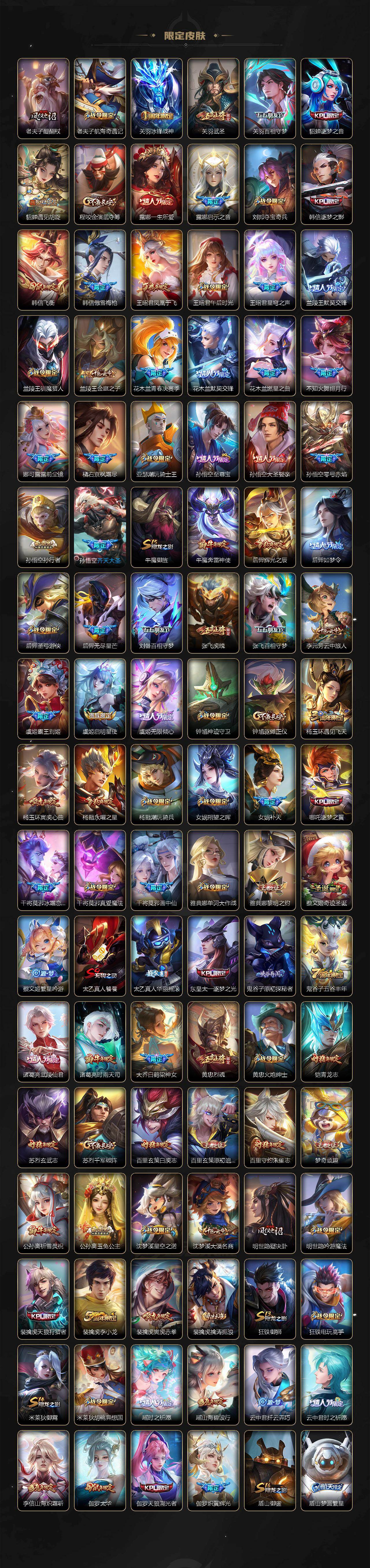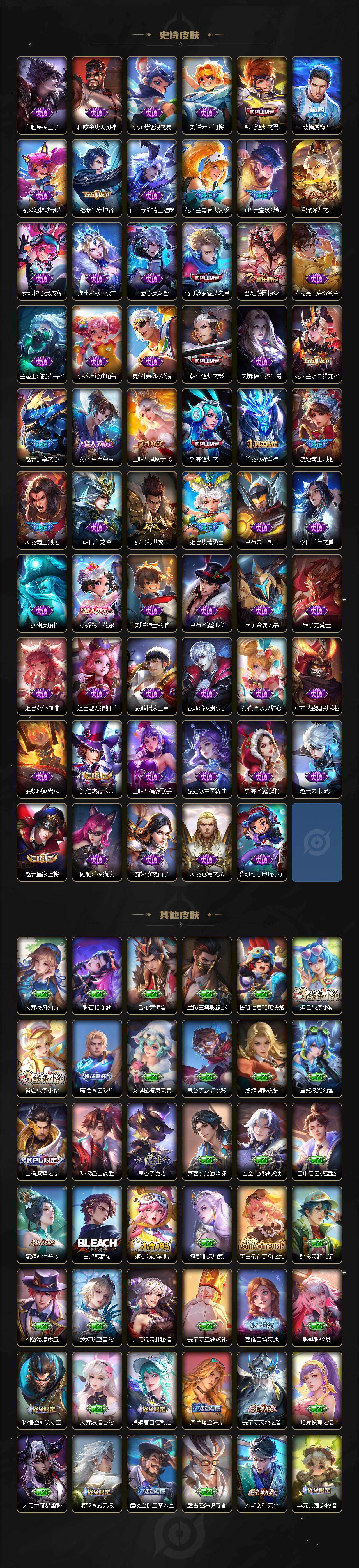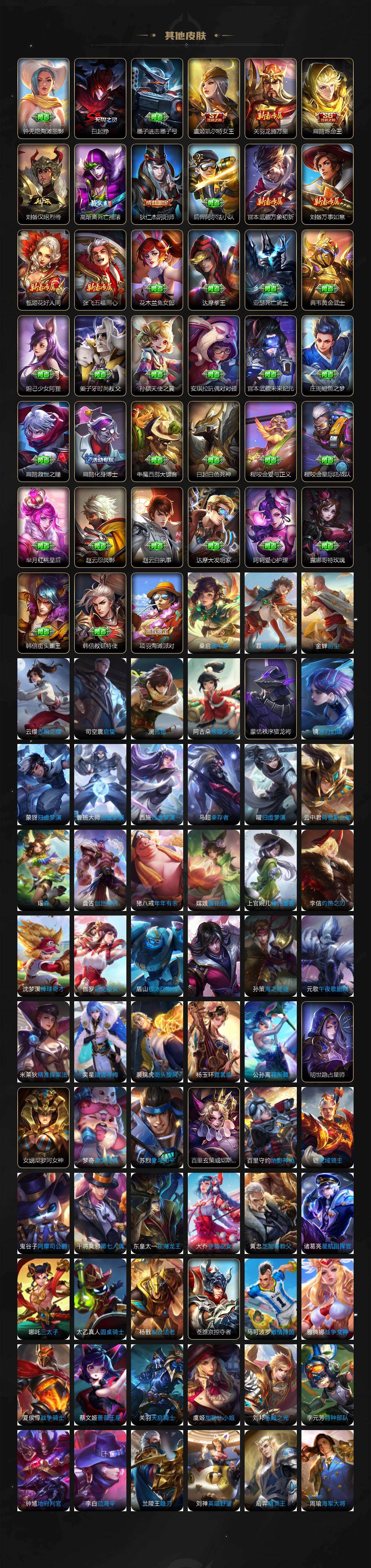 【英雄全皮】:妲己全皮,刘邦全皮,孙权全皮,娜可露露全皮,橘右京全皮,鬼谷子全皮,伽罗全皮,盾山全皮,猪八戒全皮,敖隐全皮,夏洛特全皮,戈娅全皮,空空儿全皮,影全皮