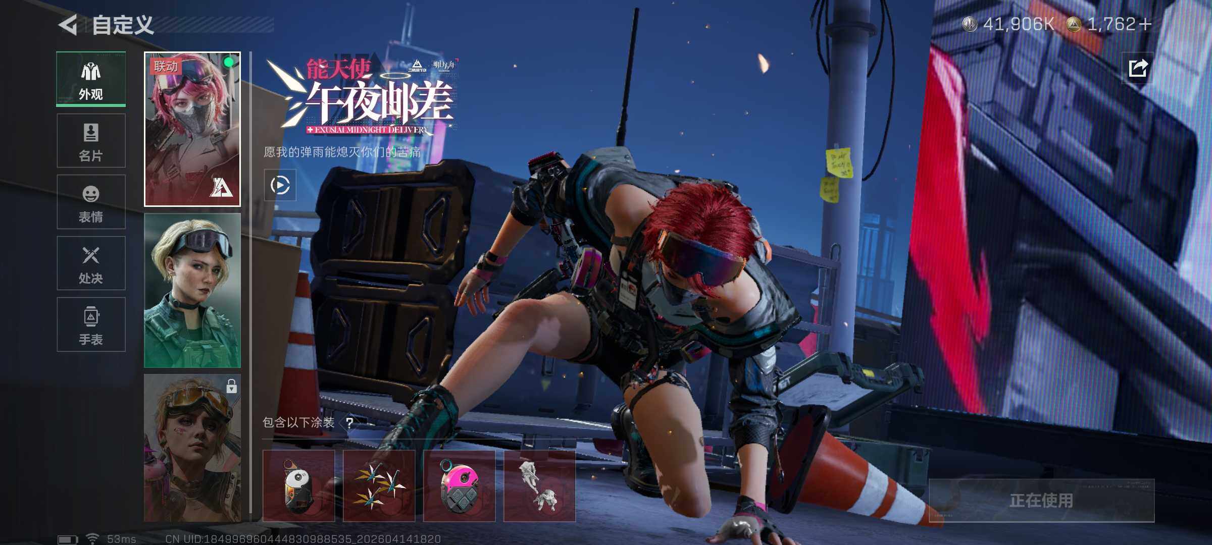 【干员外观】:红狼-蚀金玫瑰,露娜-黑·天际线,蛊-能天使午夜邮差,骇爪-维什戴尔,威龙-凌霄戍卫,蜂医-送葬人·无题密令,无名-夜鹰,深蓝-不破誓约,红狼-电锯惊魂,露娜-金牌射手,乌鲁鲁-荒原猎手