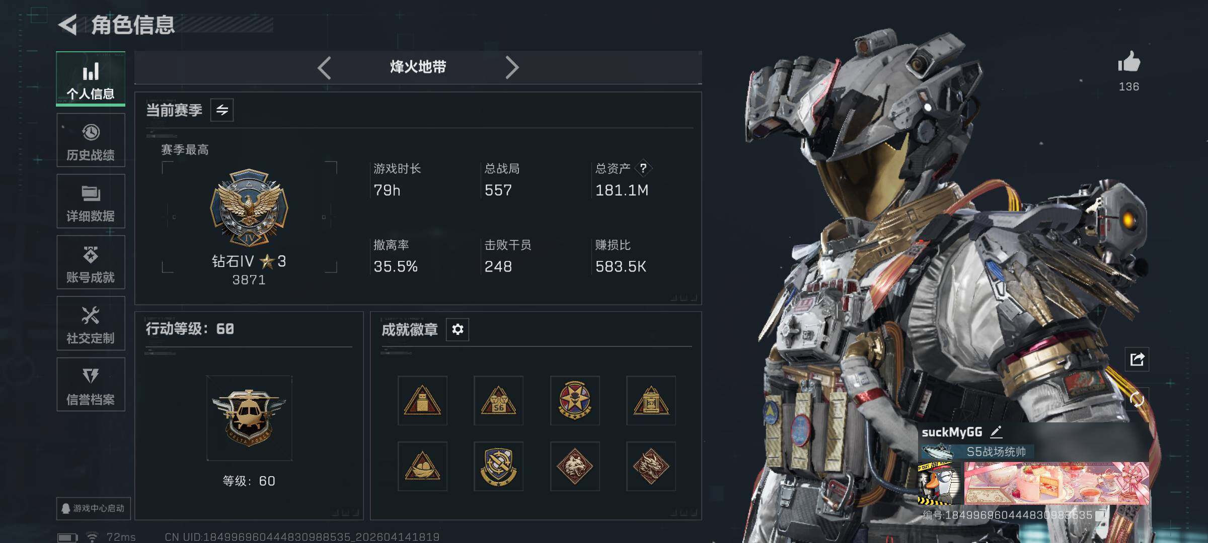 181m总资产-41906k哈夫币-60烽火等级-钻石-50战场等级-军士长