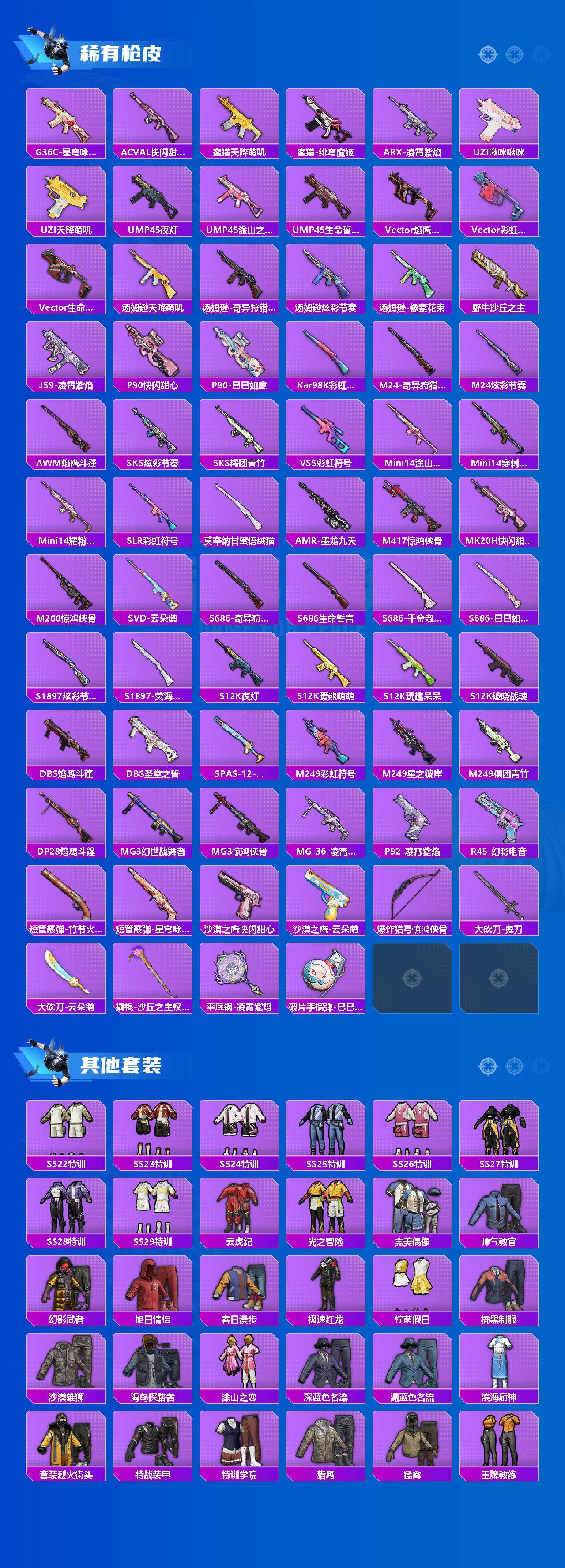 【粉色枪皮等级】:SCAR-L-锦绣绵绵(五级),AUG-暖羊咩咩(五级),ACE32-萌骑漫游(四级),ARX-无垠阁(七级),UMP45-量子极限(五级),Kar98K-巳巳如意(五级),Mk14-甜梦熊击(五级),DP-28-豹影疾电(五级)