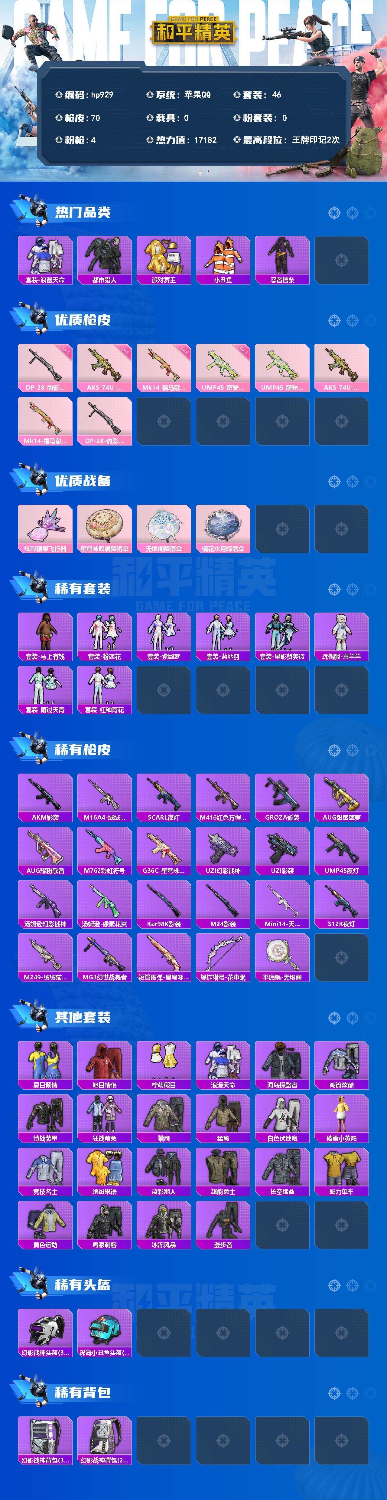 苹果 手Q-0粉装-4特效枪-0载具-1粉色飞行器-17182热力值-2王牌印记-46套装-70枪皮