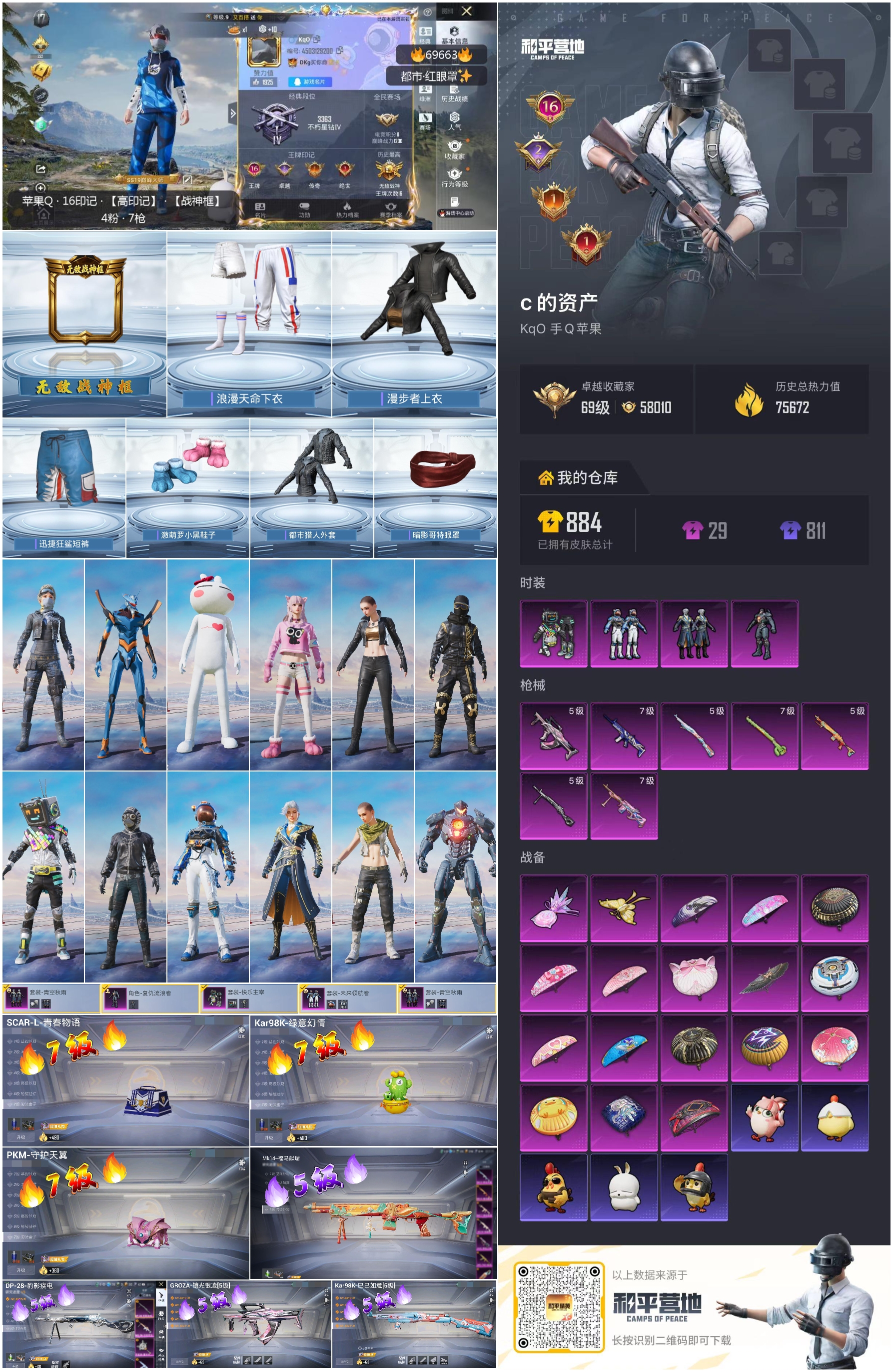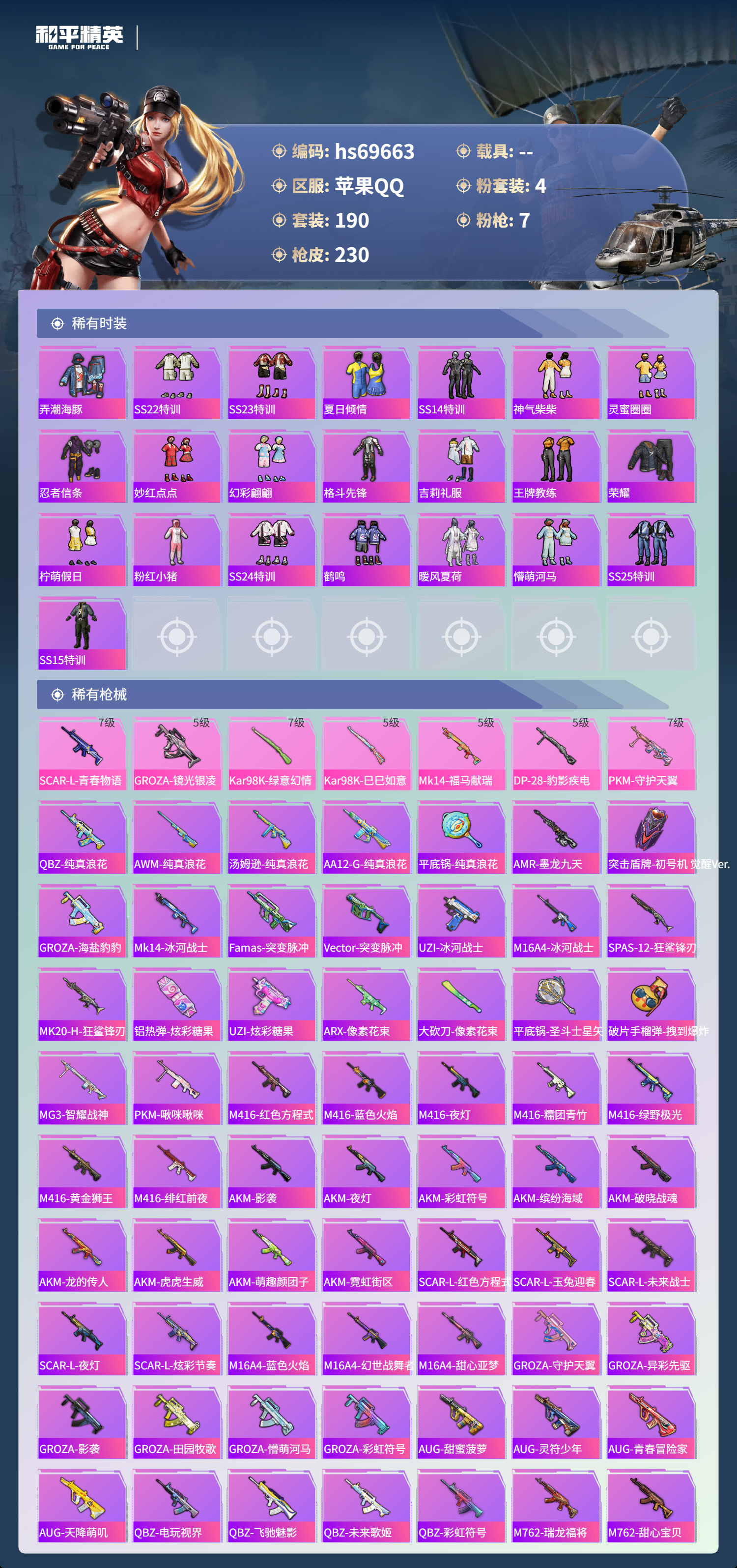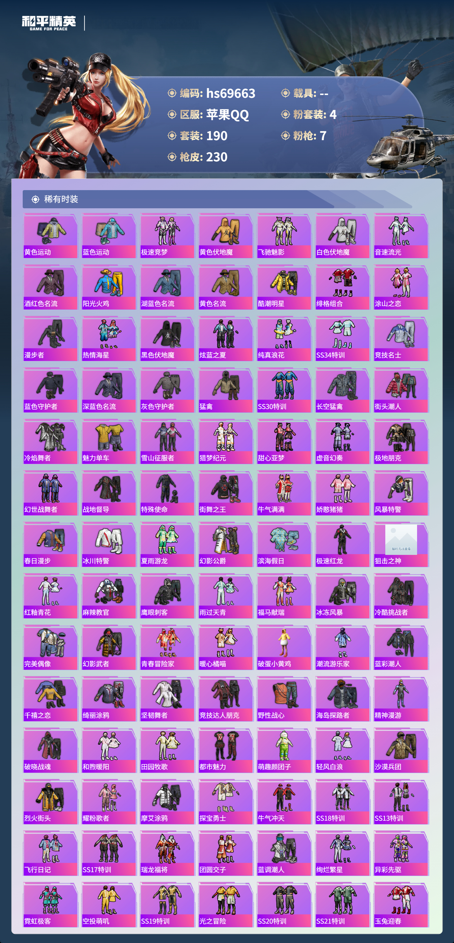 hs69663 苹果手Q-16王牌印记-有战神框-4粉装-7特效枪-75672热力值-190套装-230枪皮-2卓越印记-1传奇印记