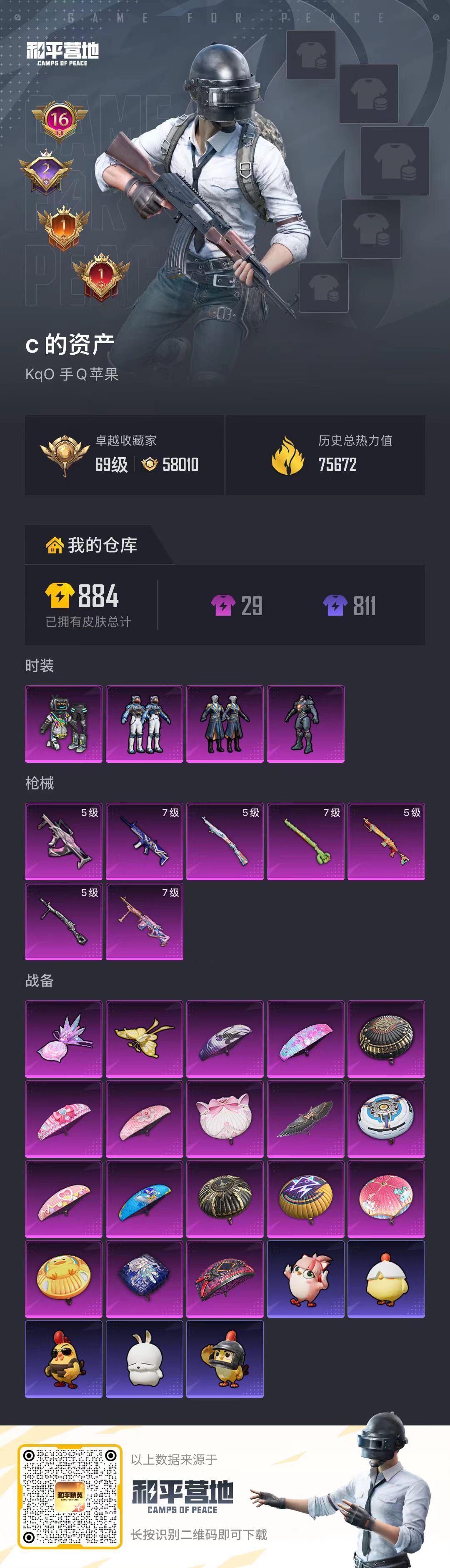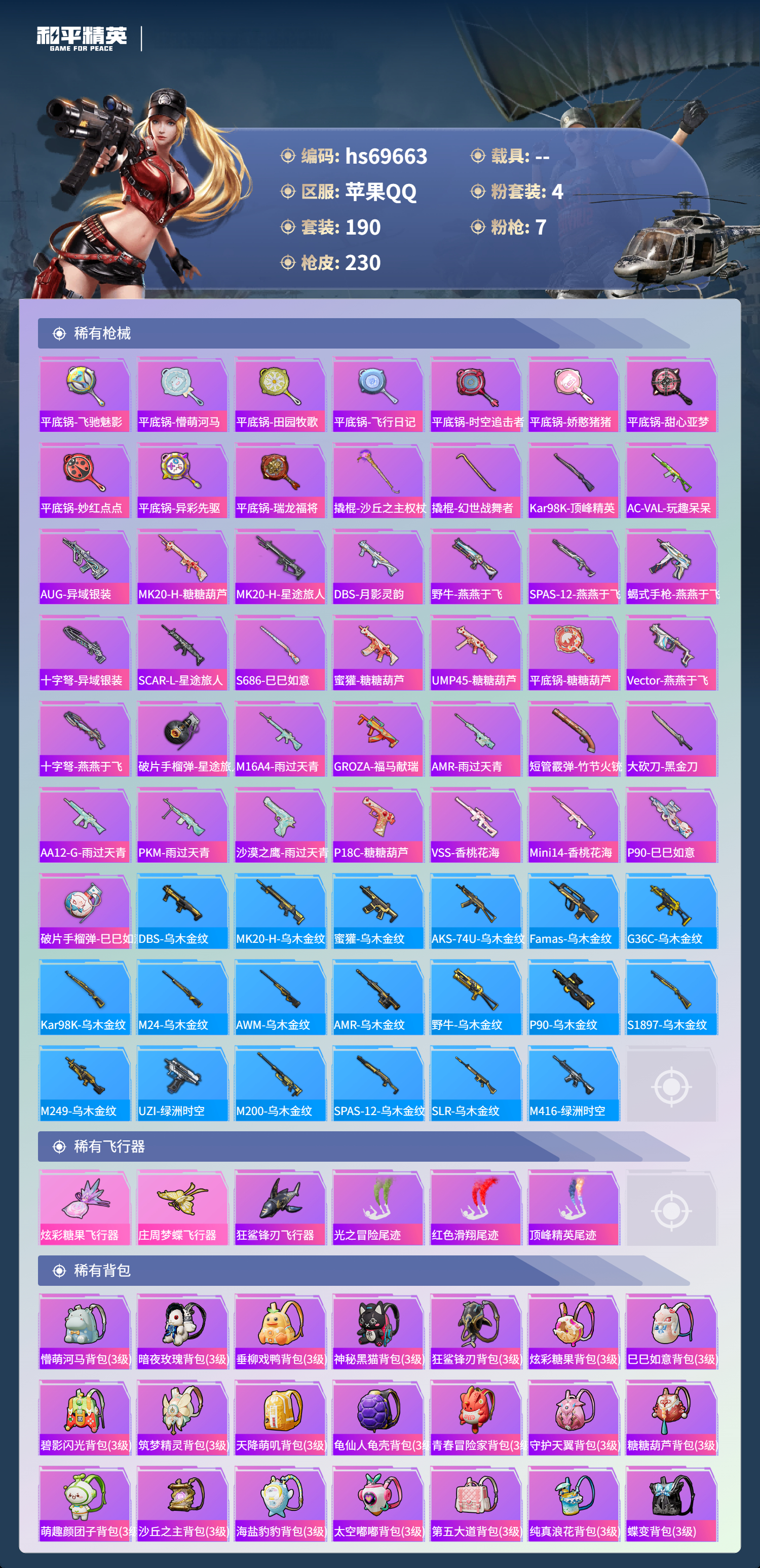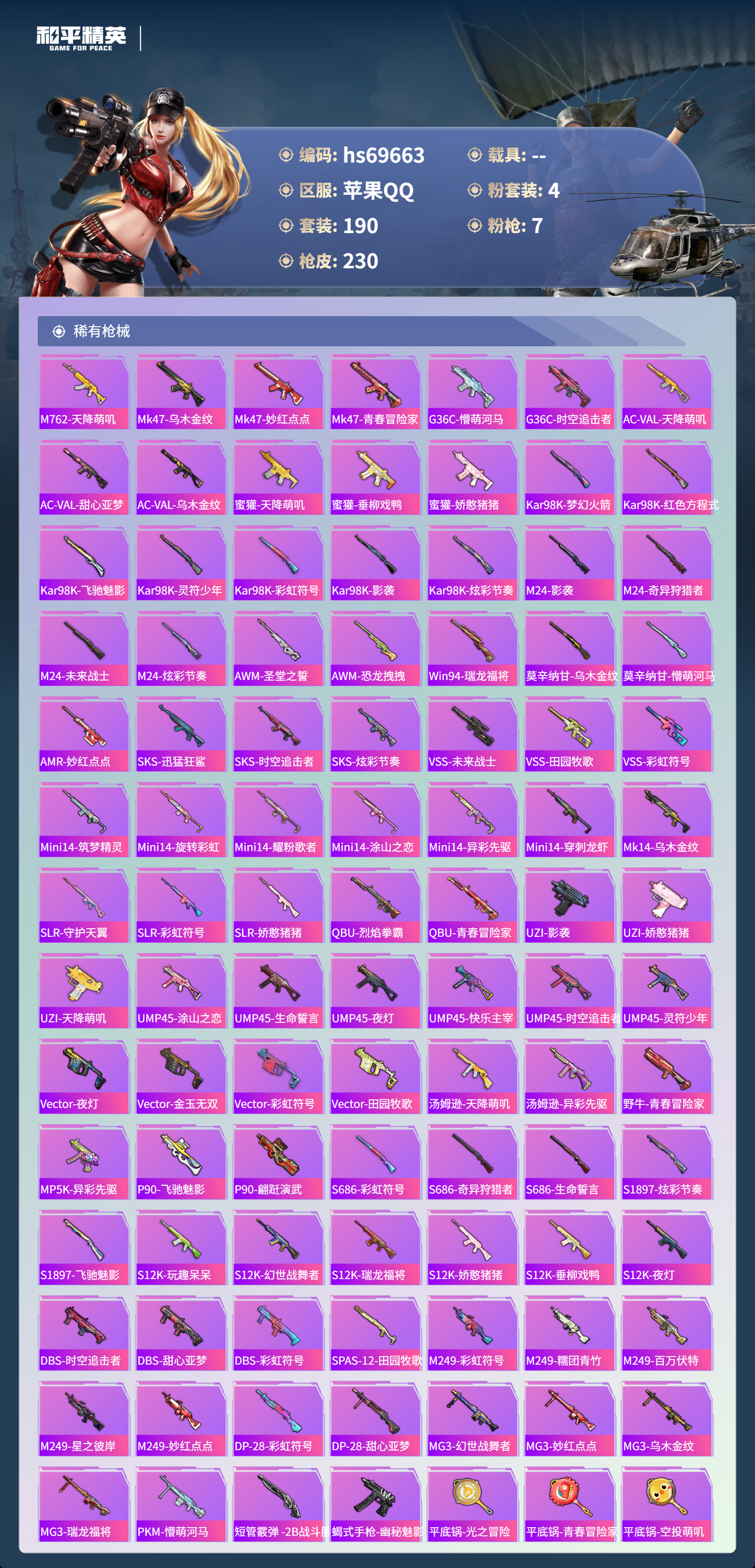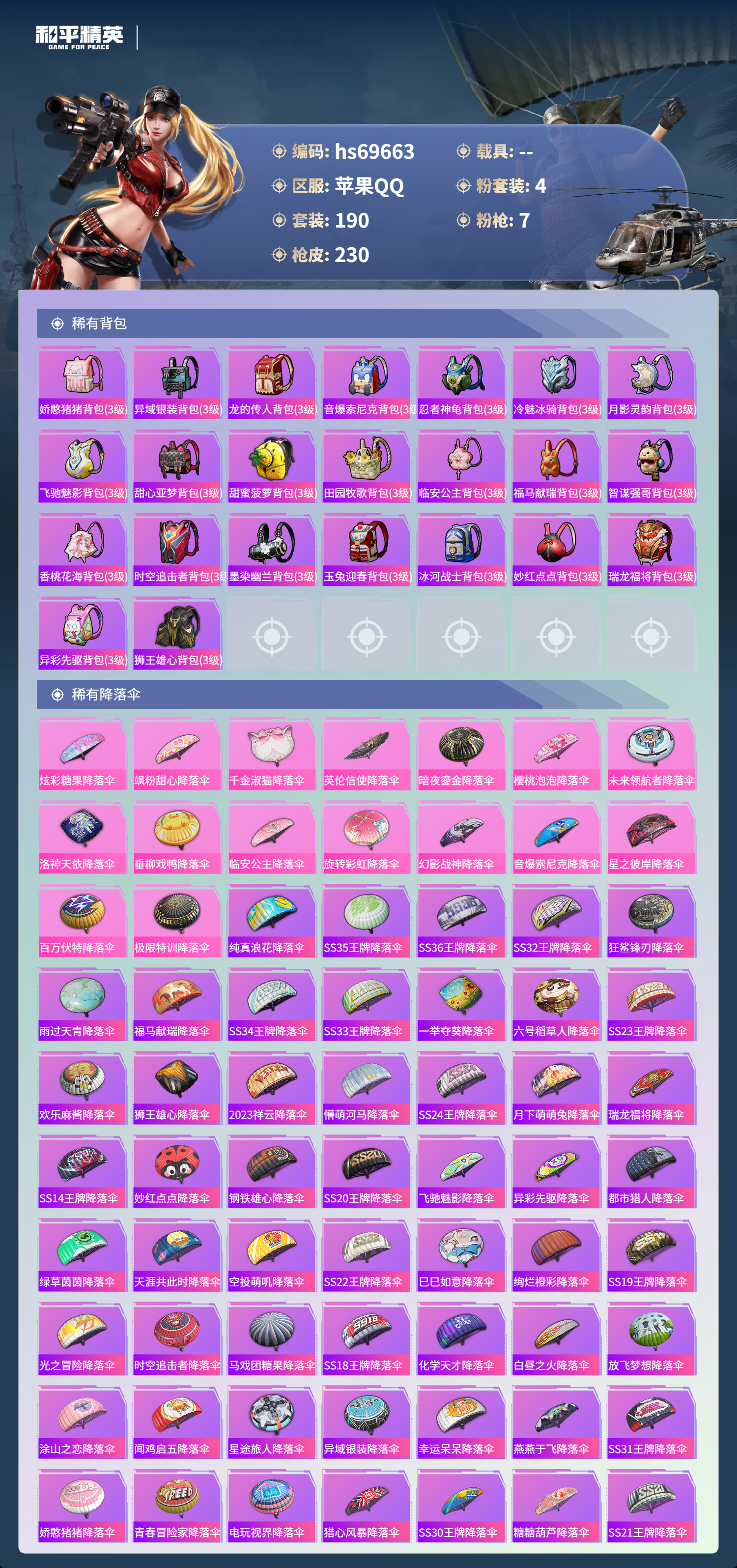 hs69663 苹果手Q-16王牌印记-有战神框-4粉装-7特效枪-75672热力值-190套装-230枪皮-2卓越印记-1传奇印记