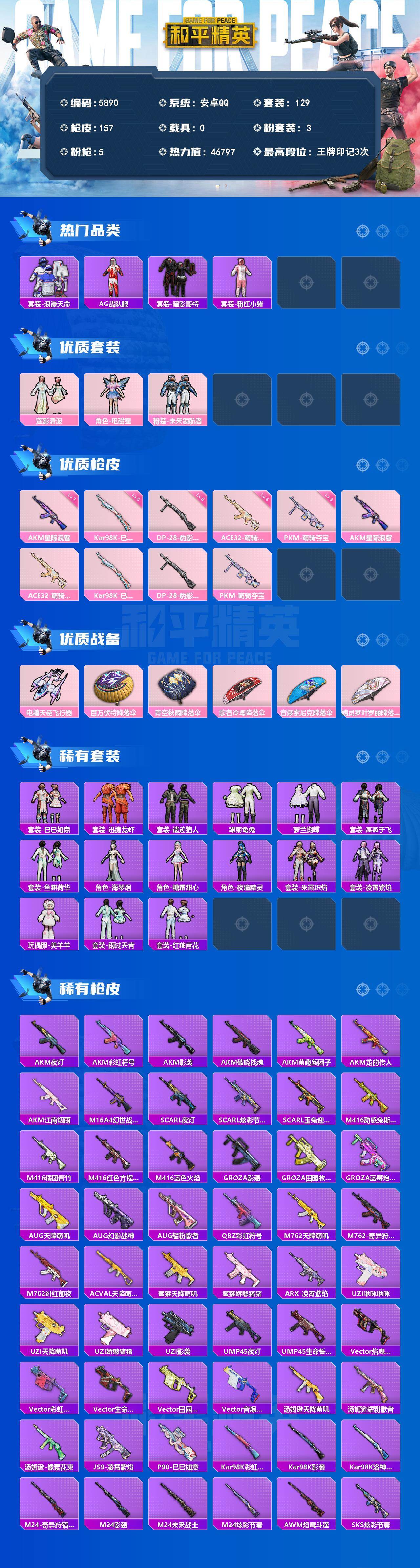 129套装/枪械5/装备172/战备102/王牌印记3/热力值46797/七级AKM-星际浪客/四级ACE32-萌骑漫游/五级Kar98K-巳巳如意/五级DP-28-豹影疾电/三级PKM-萌骑夺宝/套装-浪漫天命/AG战队服/套装-暗影哥特/套装-粉红小猪/莲影清波/电磁星/粉装-未来领航者/AKM-星际浪客/ACE32-萌骑漫游/Kar98K-巳巳如意/DP-28-豹影疾电/PKM-萌骑夺宝
