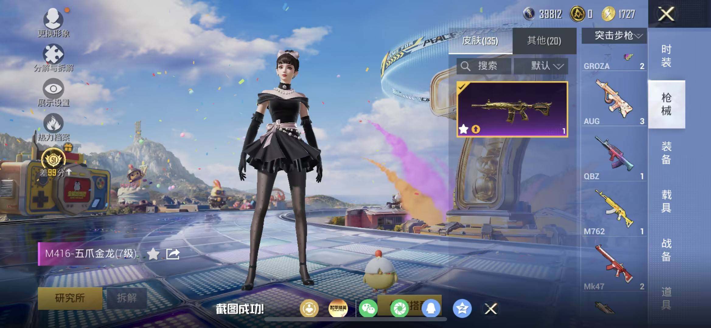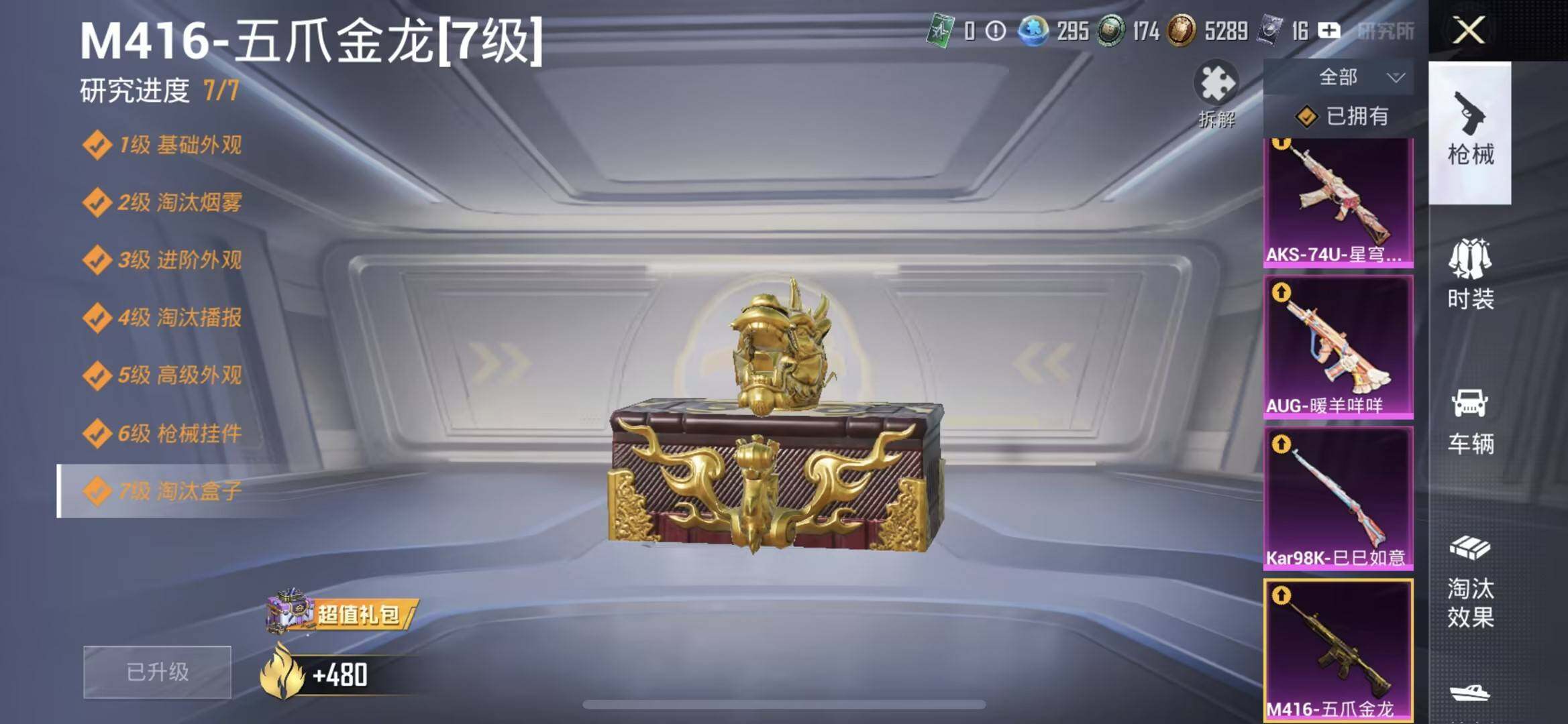 【粉色枪皮等级】:M416-五爪金龙(七级),AUG-暖羊咩咩(五级),AKS-74U-星穹咏叹调(七级),Kar98K-巳巳如意(五级),DP-28-豹影疾电(五级)