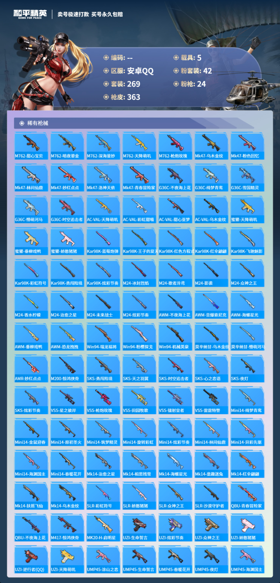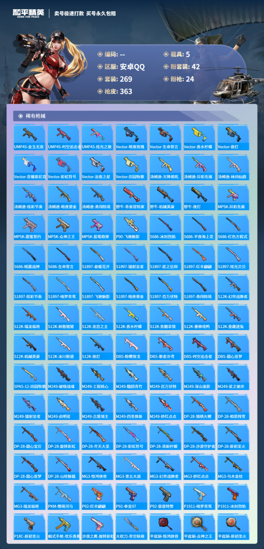 5载具269套装-363枪皮-安卓手Q-19王牌印记-42粉装-24特效枪-5载具-热力值-269套装-363枪皮-0卓越印记-0传奇印记