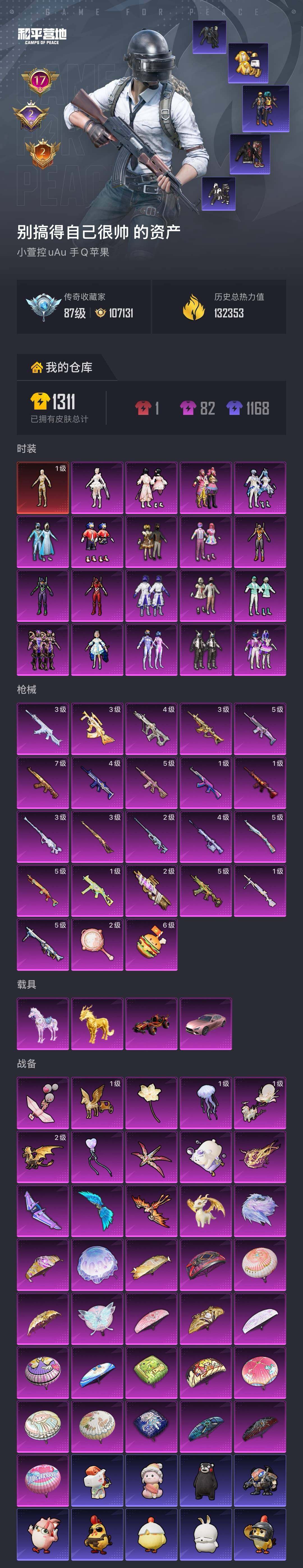 【AZH3738】苹果 手Q【无敌战神框 一级图卡盟 雪国巧克力都市赤蝎三螳螂梦幻火箭金靴子 满级甜心宝贝AKM 粉熊背包 4载具1僚机 合金龙骨(红)】无敌战神框-1神装-19粉装-23特效枪-4载具-13粉色飞行器-132353热力值-17王牌印记-261套装-339枪皮