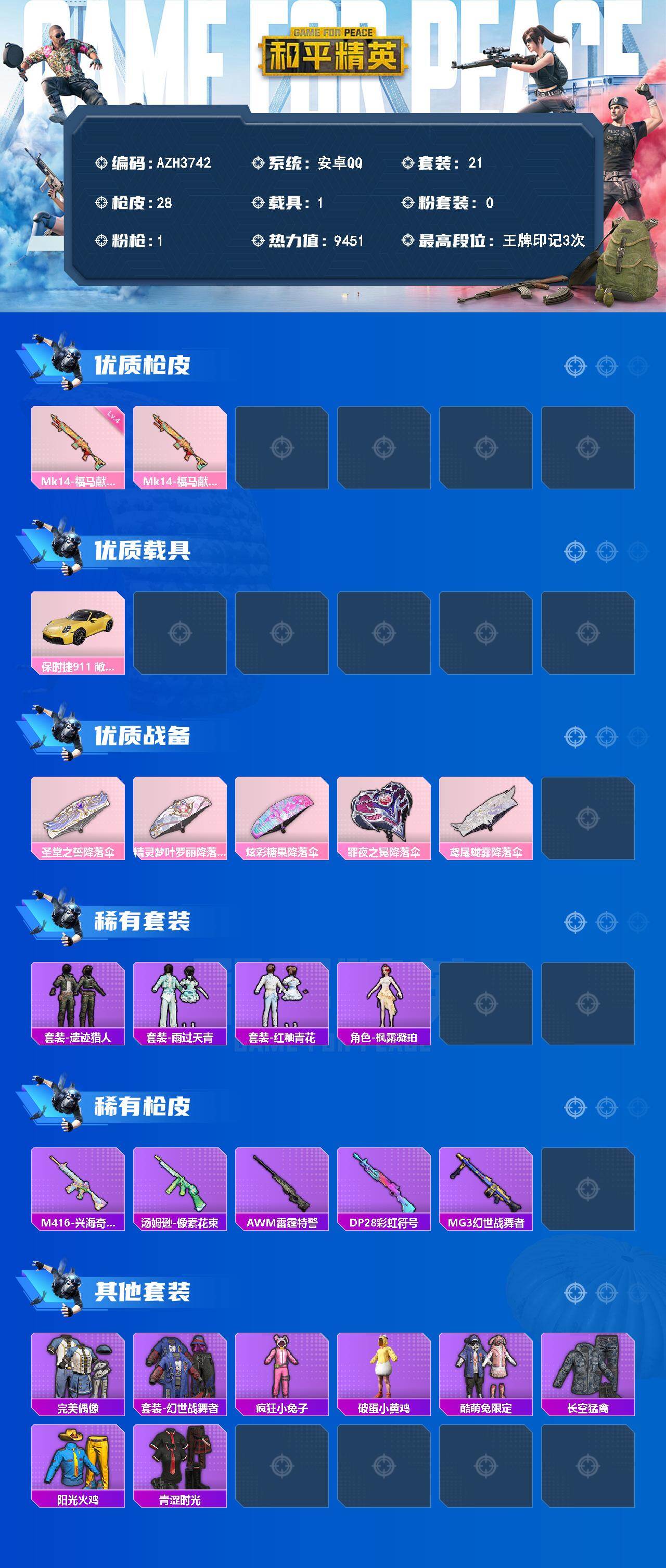 【AZH3742】安卓 手Q【1载具】0粉装-1特效枪-1载具-0粉色飞行器-9451热力值-3王牌印记-21套装-28枪皮