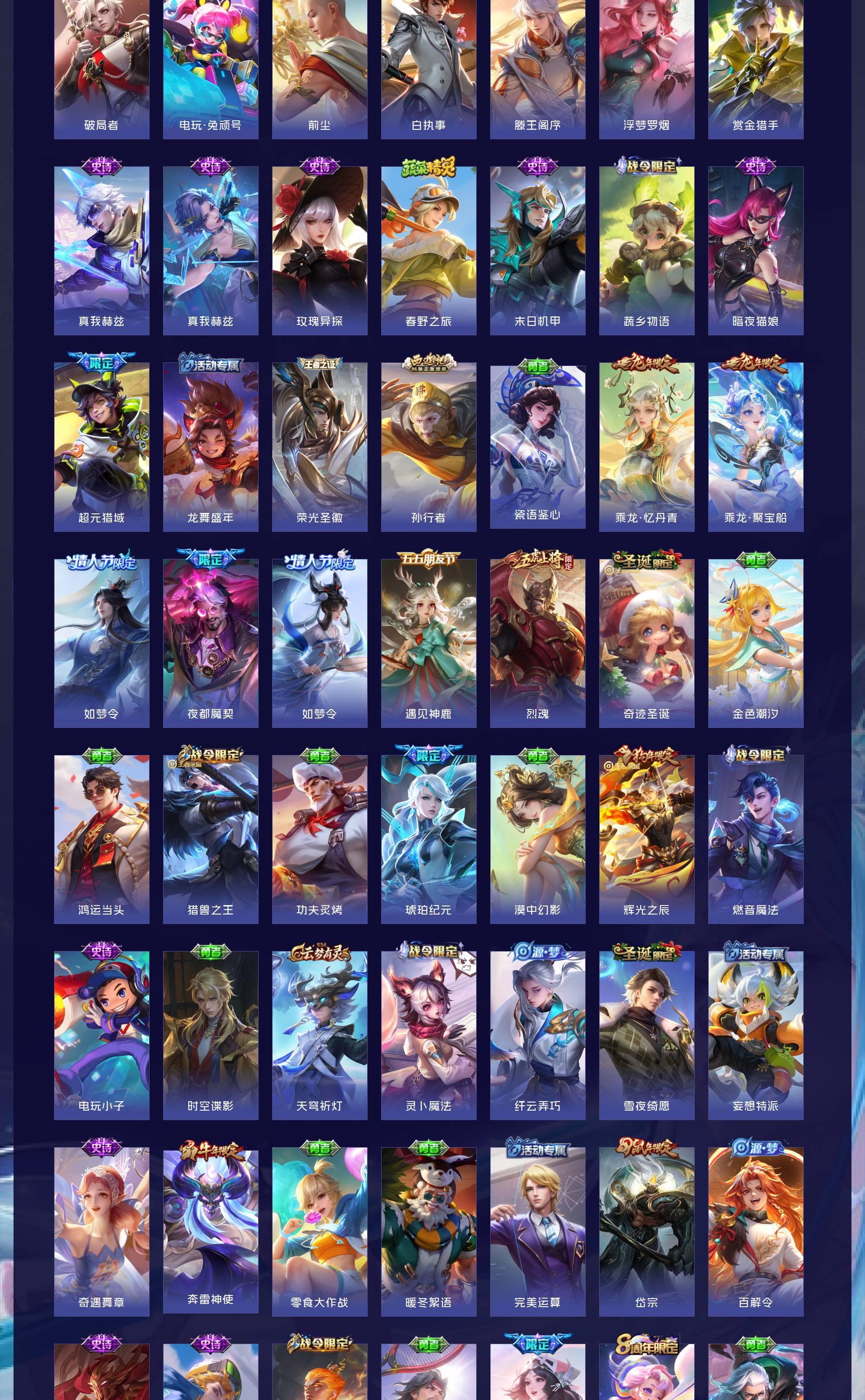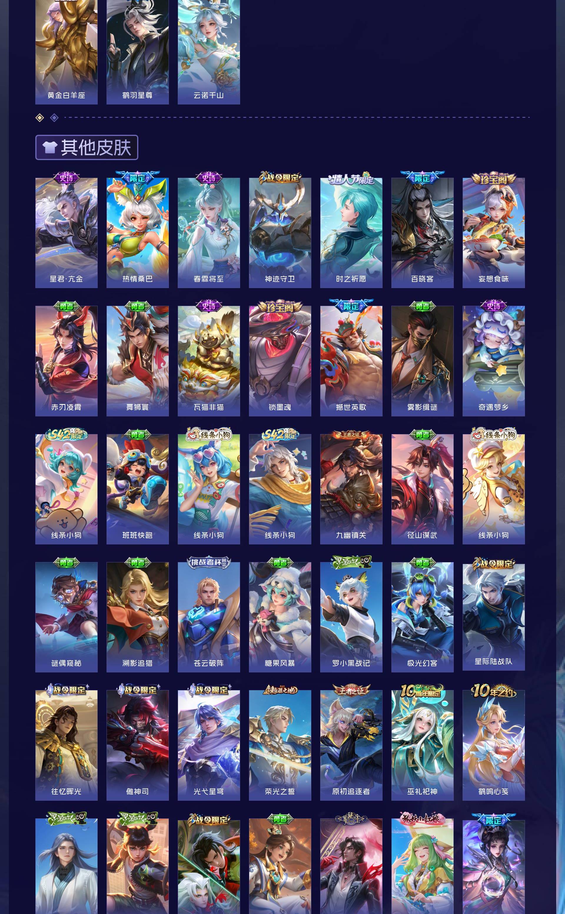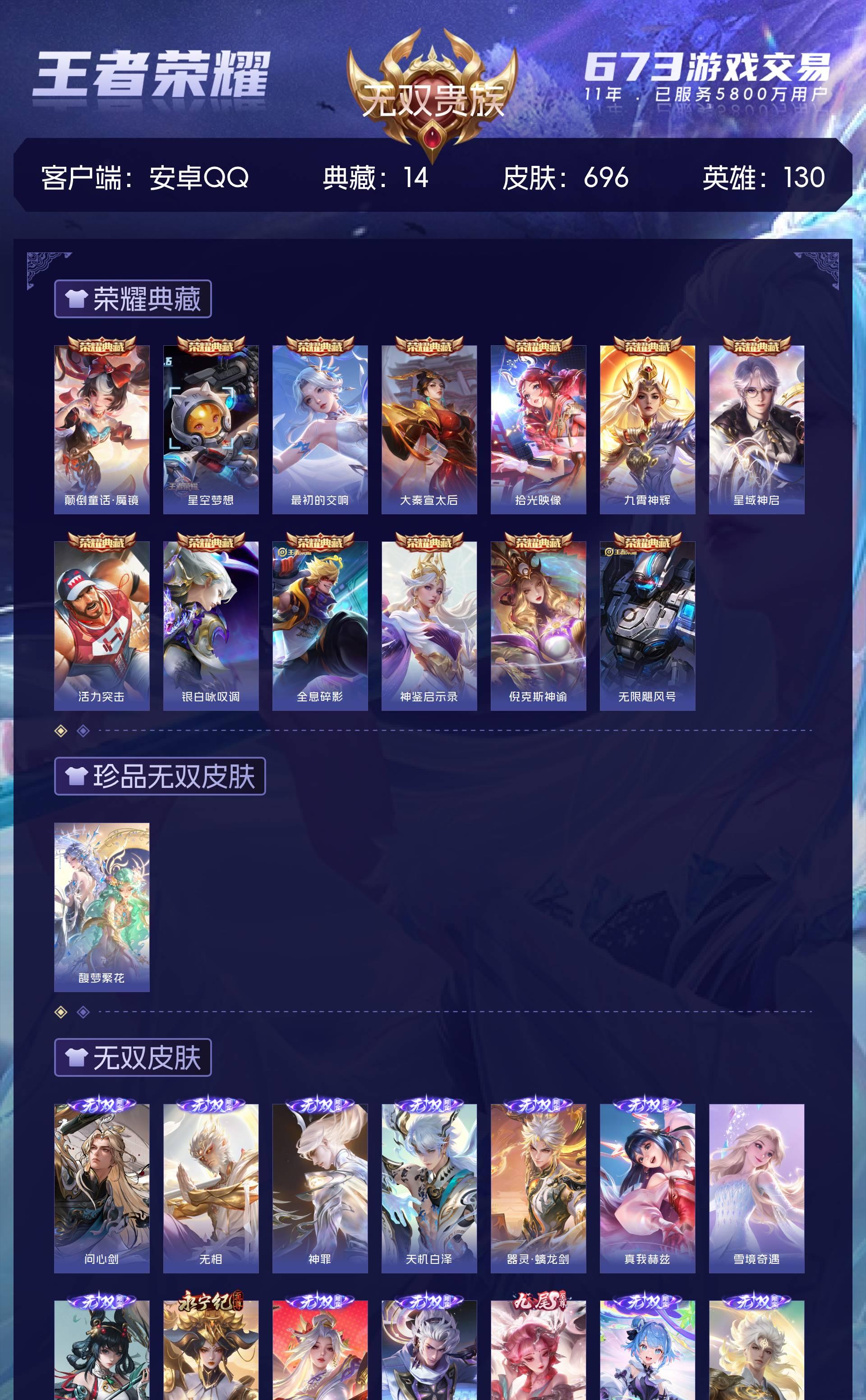 无双贵族 皮肤696 英雄130 至尊星耀 荣耀典藏14 珍品无双1 无双皮肤14 珍品传说10 传说130