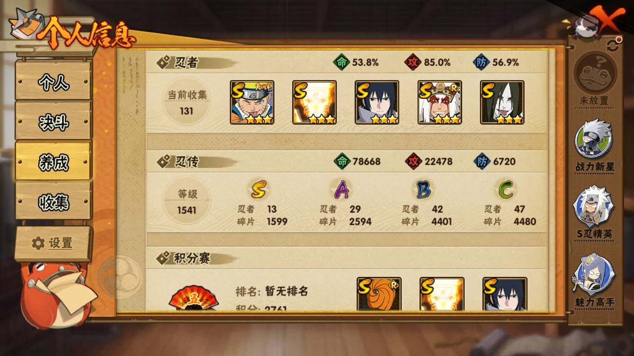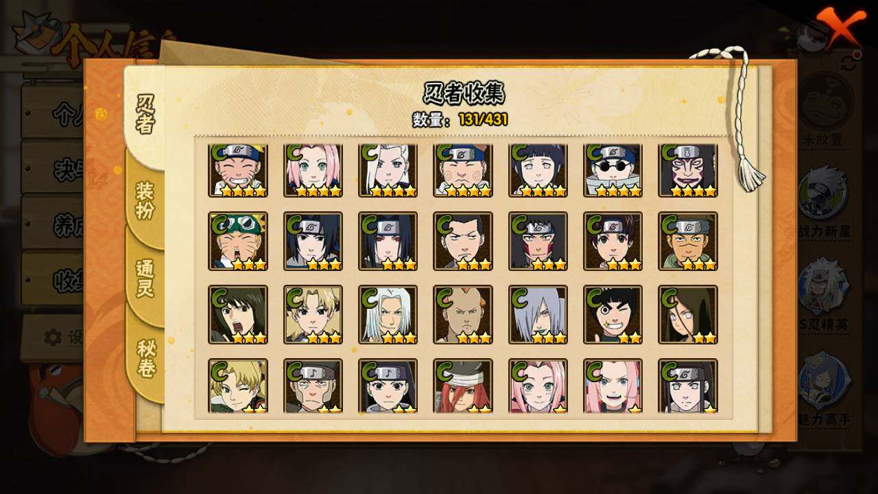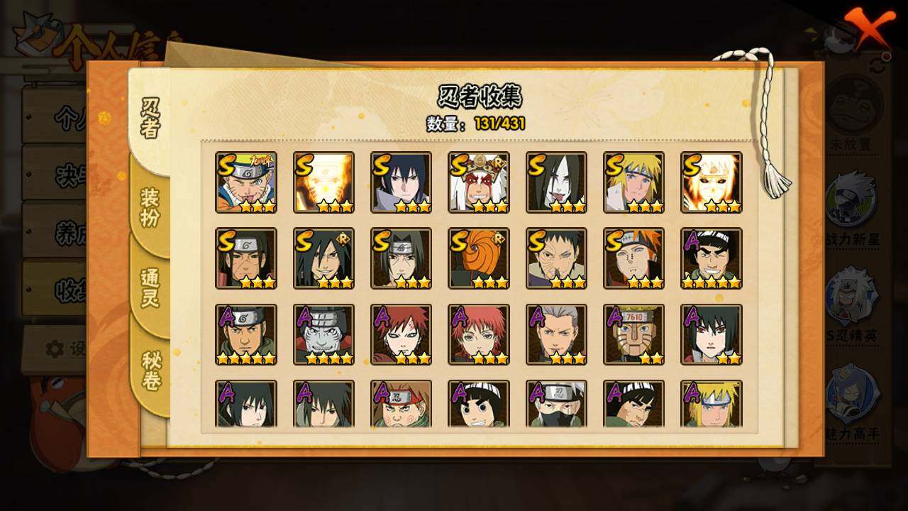 【S级忍者】:千手柱间「秽土转生」(3星),宇智波带土「忍界大战」(3星),宇智波鼬「须佐能乎」(3星),自来也「舞之豪杰」(3星),大蛇丸(3星),波风水门(3星),漩涡鸣人「九喇嘛连结」(3星),佩恩「天道」(3星),宇智波佐助「永恒万花筒」(3星),波风水门「九喇嘛连结」(3星),宇智波斑「五影会谈」(3星),漩涡鸣人·宇智