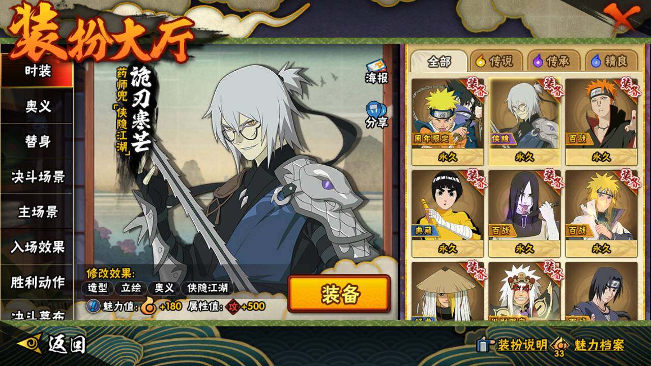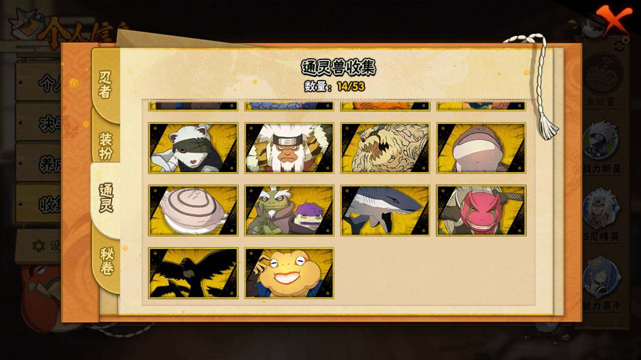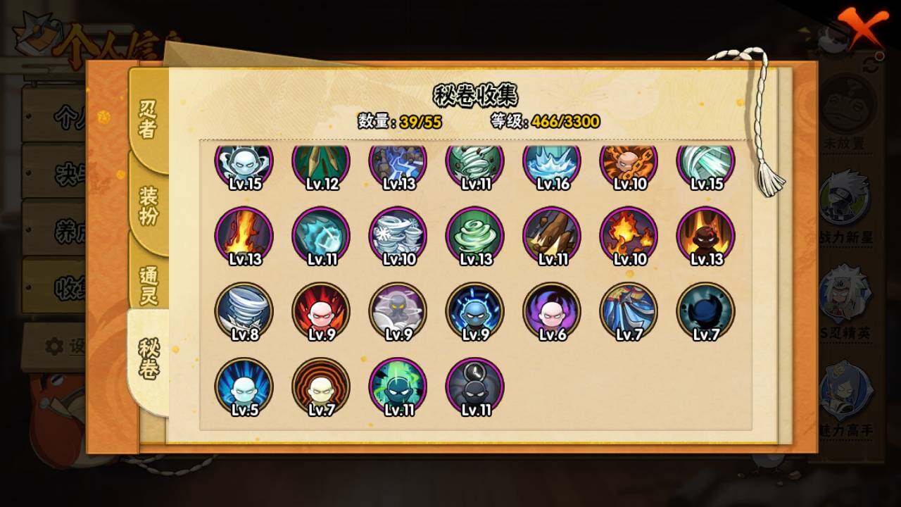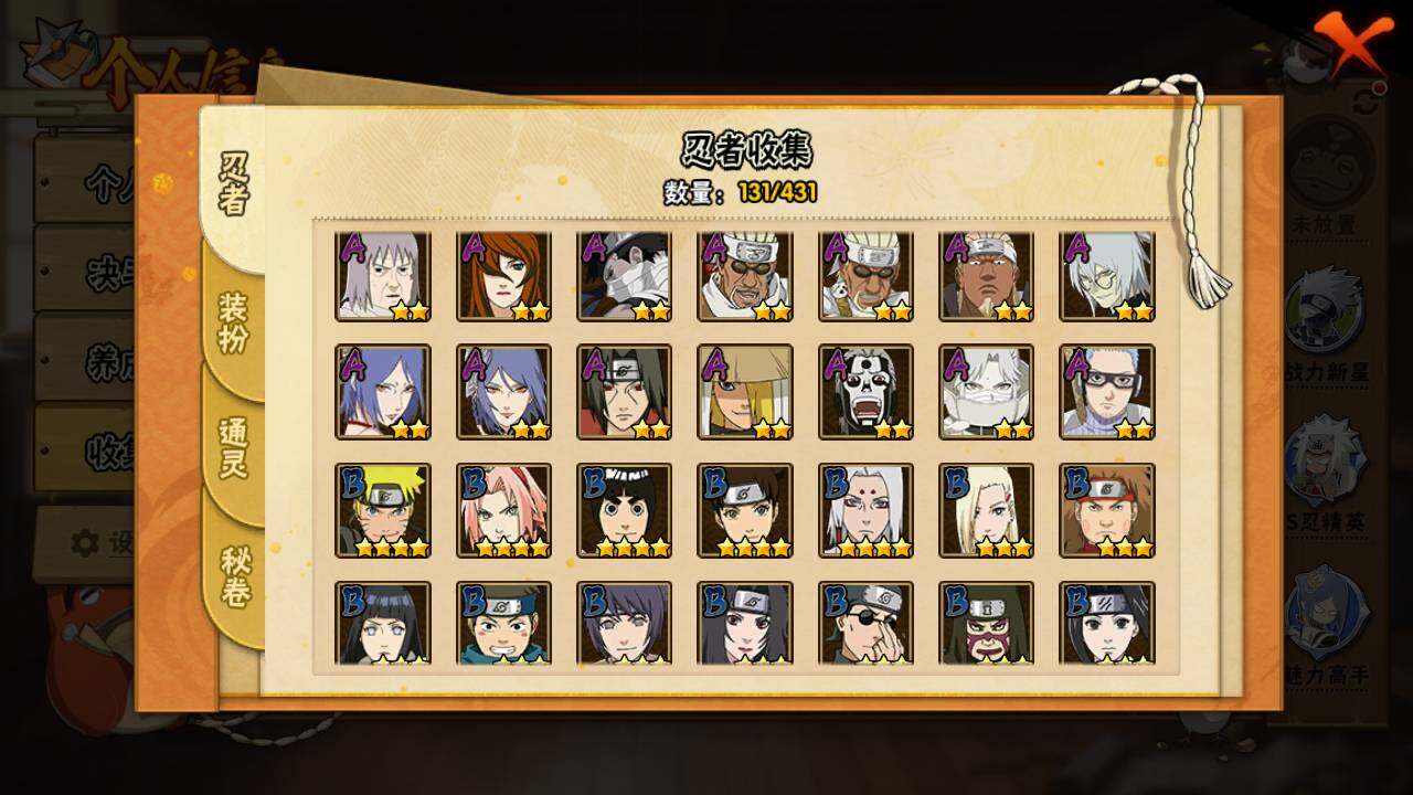 【S级忍者】:千手柱间「秽土转生」(3星),宇智波带土「忍界大战」(3星),宇智波鼬「须佐能乎」(3星),自来也「舞之豪杰」(3星),大蛇丸(3星),波风水门(3星),漩涡鸣人「九喇嘛连结」(3星),佩恩「天道」(3星),宇智波佐助「永恒万花筒」(3星),波风水门「九喇嘛连结」(3星),宇智波斑「五影会谈」(3星),漩涡鸣人·宇智