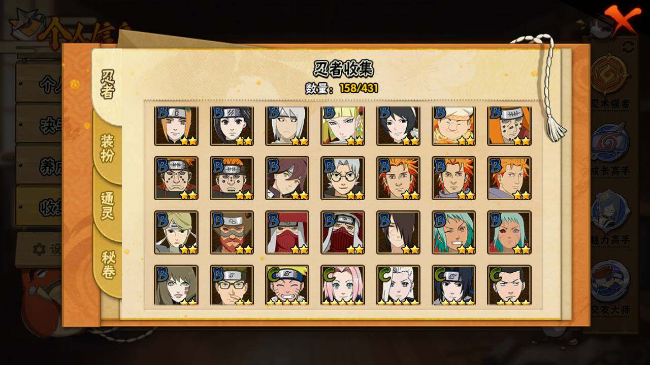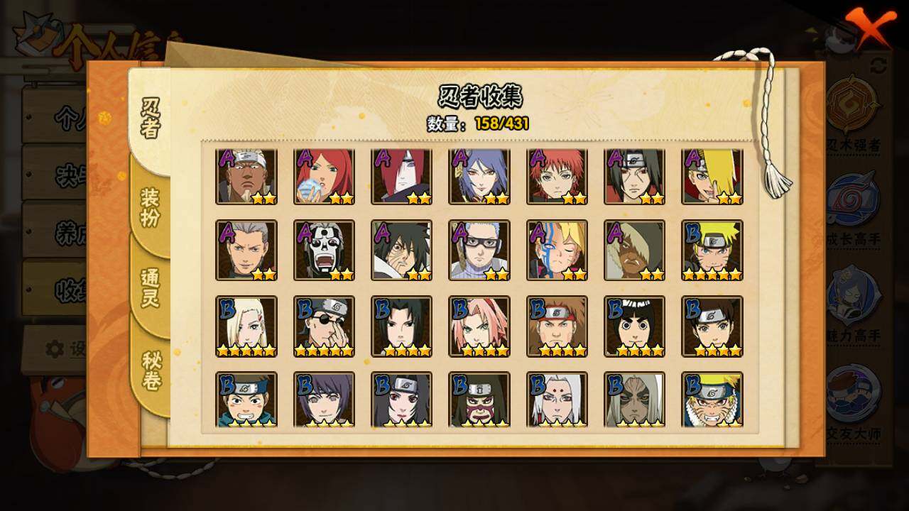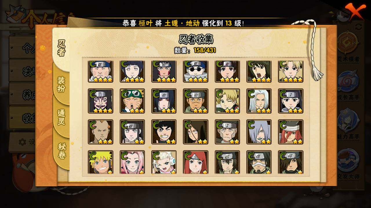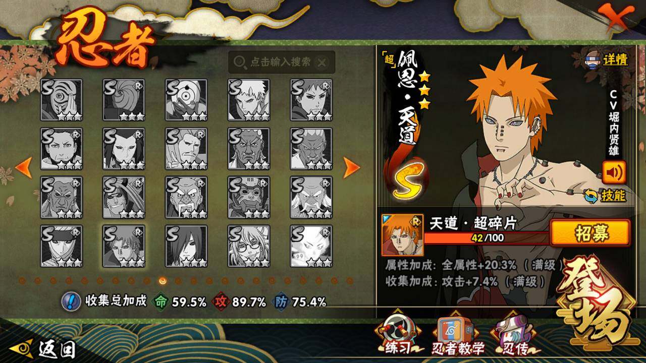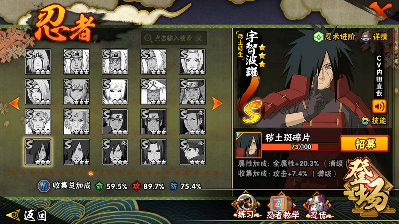 【S级忍者】:宇智波斑「秽土转生·解」(3星),宇智波带土「忍界大战」(3星),宇智波鼬「须佐能乎」(3星),旗木卡卡西「须佐能乎」(3星),宇智波斑「木叶创立」(3星),自来也「舞之豪杰」(3星),大蛇丸(3星),波风水门(3星),神秘面具男「红夜之刃」(3星),漩涡鸣人「九喇嘛连结」(3星),迈特