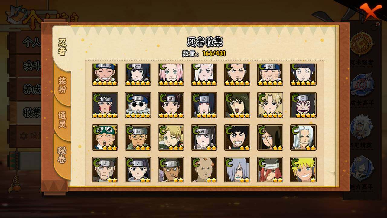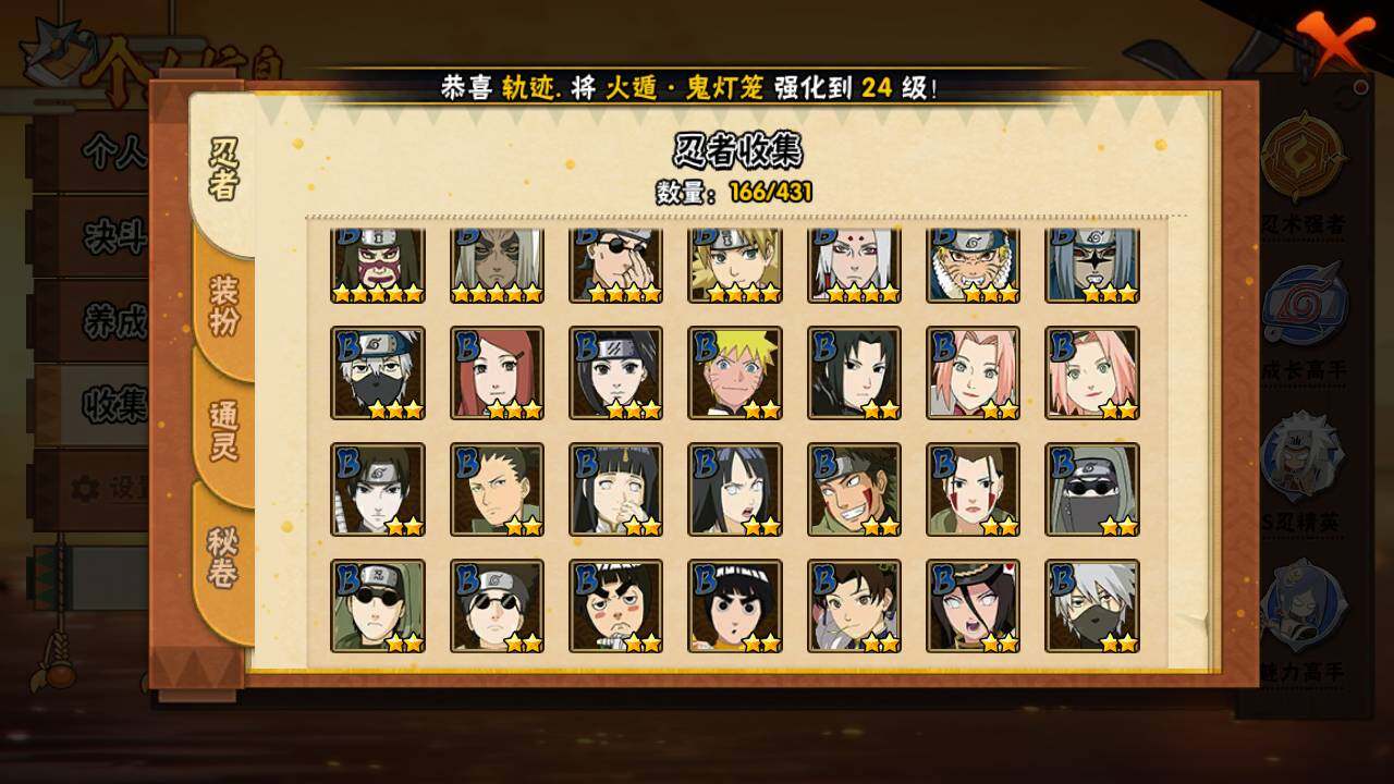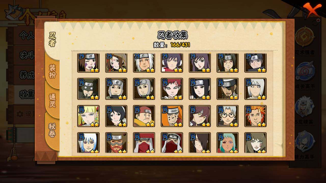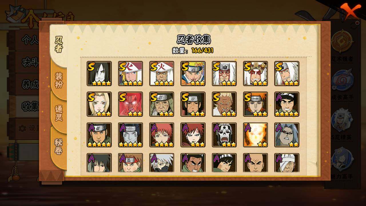 【S级忍者】:猿飞日斩「秽土转生」(3星),千手柱间「秽土转生」(3星),艾「忍界大战」(3星),自来也「仙人模式」(3星),自来也「舞之豪杰」(3星),大蛇丸(4星),自来也「传说中的三忍」(3星),纲手(3星),猿飞日斩(4星),波风水门(4星)