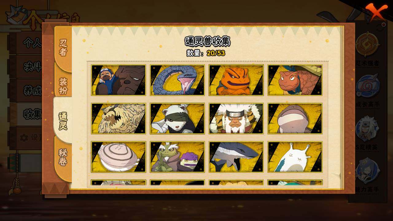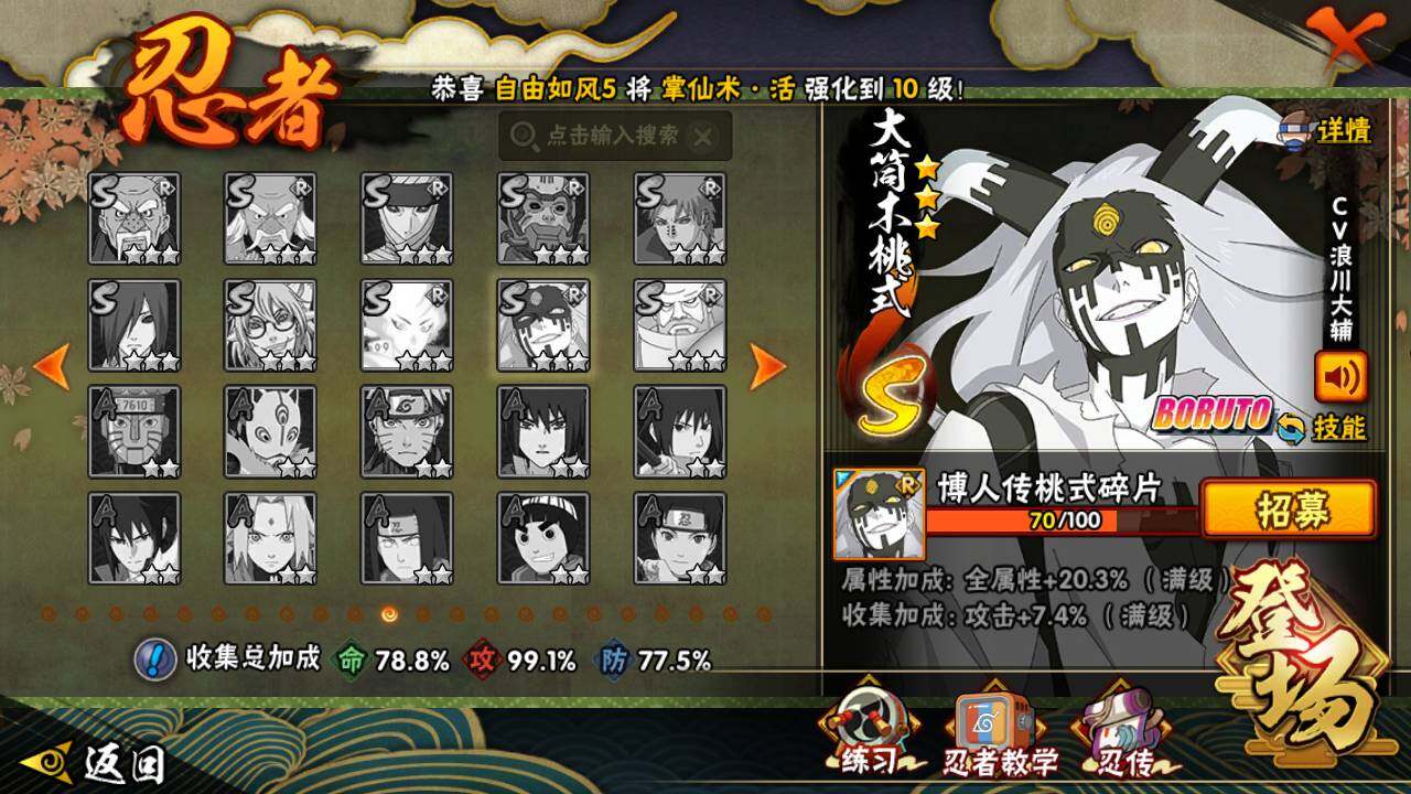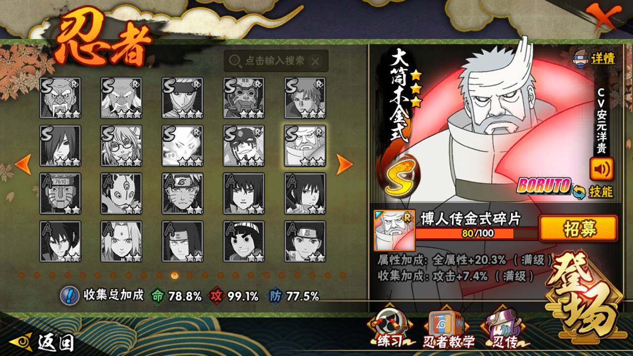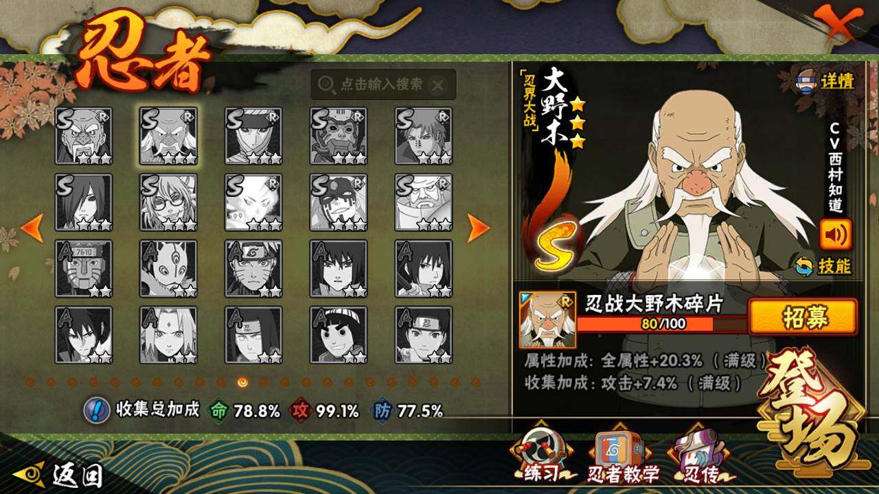 【S级忍者】:猿飞日斩「秽土转生」(3星),千手柱间「秽土转生」(3星),艾「忍界大战」(3星),自来也「仙人模式」(3星),自来也「舞之豪杰」(3星),大蛇丸(4星),自来也「传说中的三忍」(3星),纲手(3星),猿飞日斩(4星),波风水门(4星)