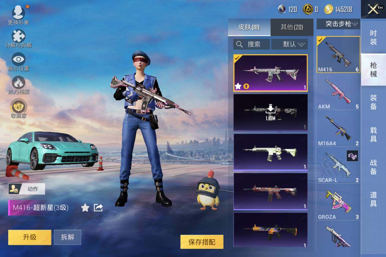 【粉色枪皮等级】:M416-超新星(三级),Kar98K-巳巳如意(五级),Mk14-福马献瑞(五级),DP-28-豹影疾电(三级)