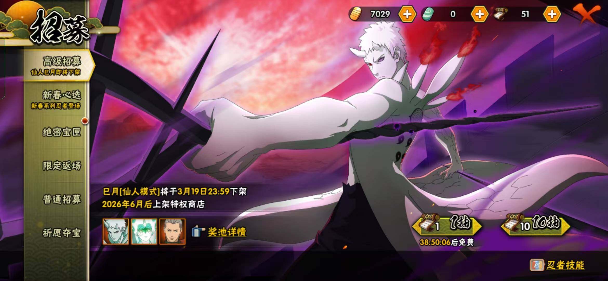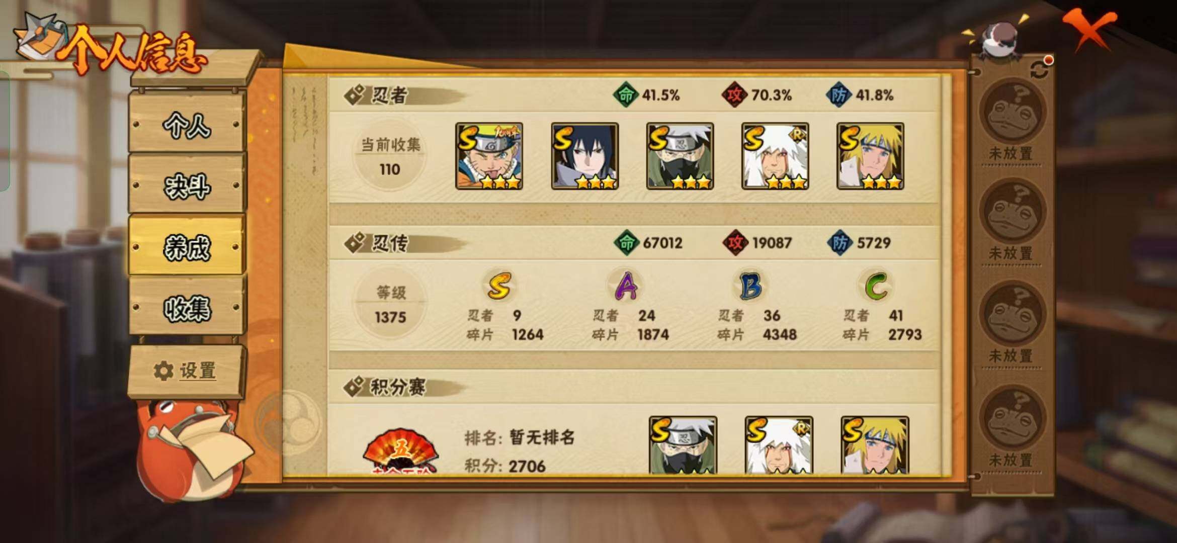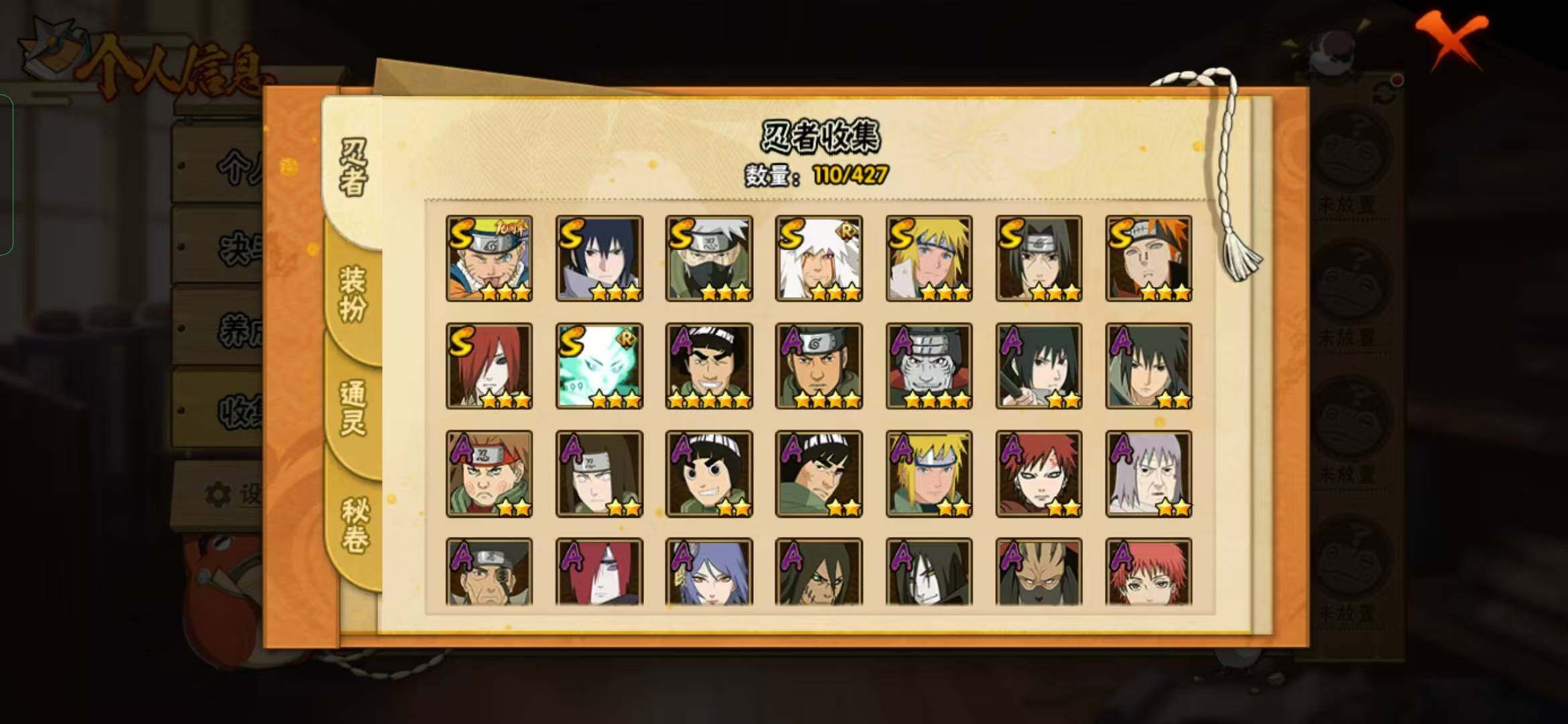 【S级忍者】:长门「秽土转生」(3星),宇智波鼬「须佐能乎」(3星),旗木卡卡西「须佐能乎」(3星),自来也「舞之豪杰」(3星),波风水门(3星),佩恩「天道」(3星),宇智波佐助「永恒万花筒」(3星),大筒木舍人「最终章」(3星),漩涡鸣人·宇智波佐助(3星)