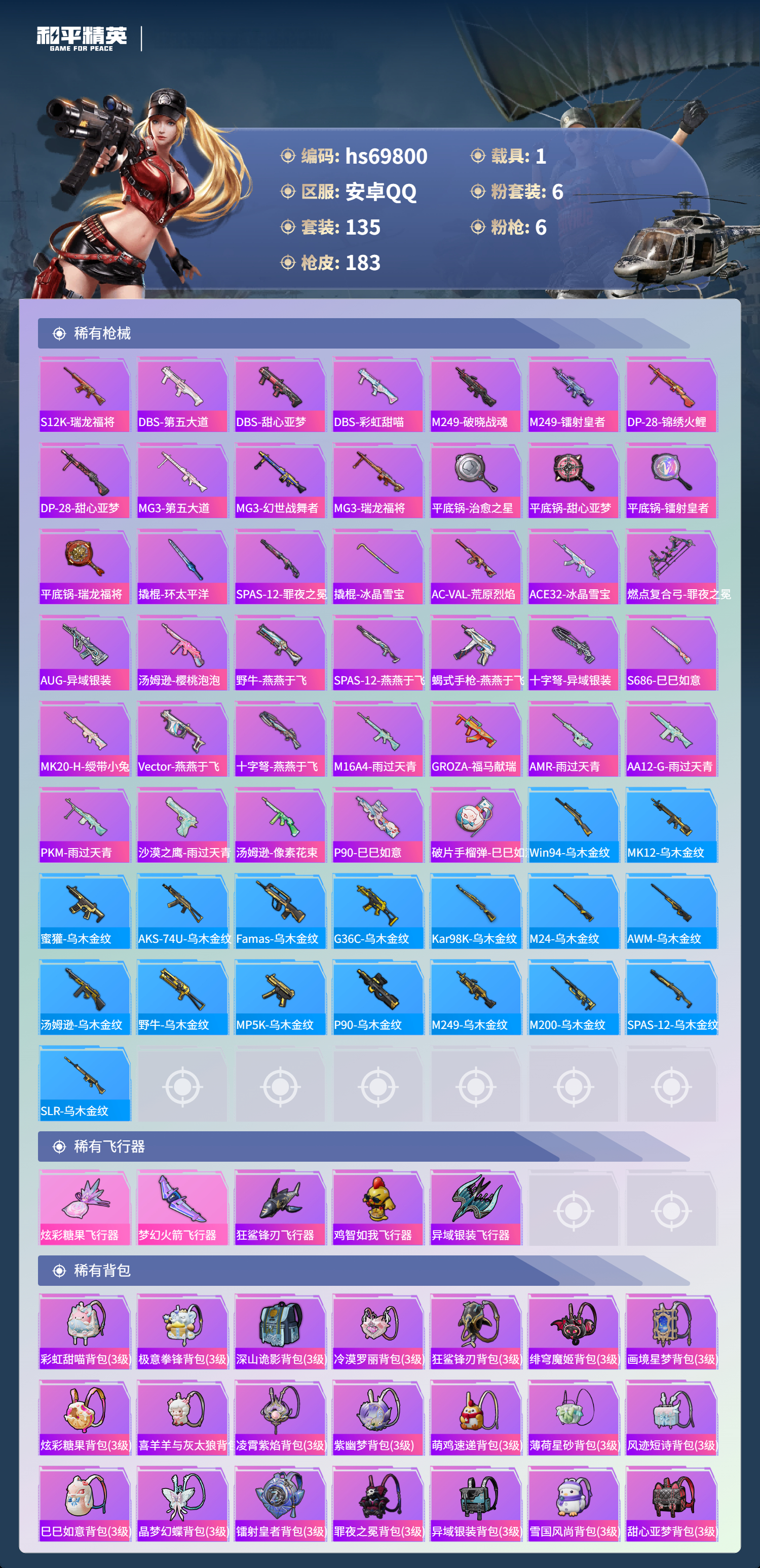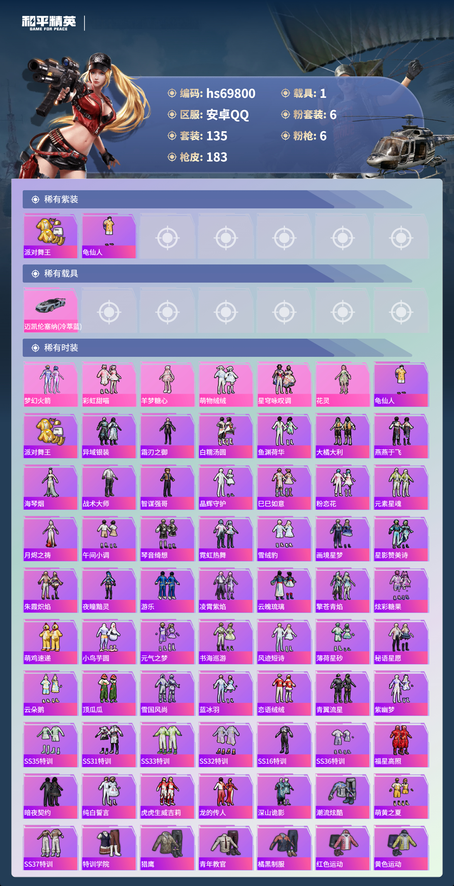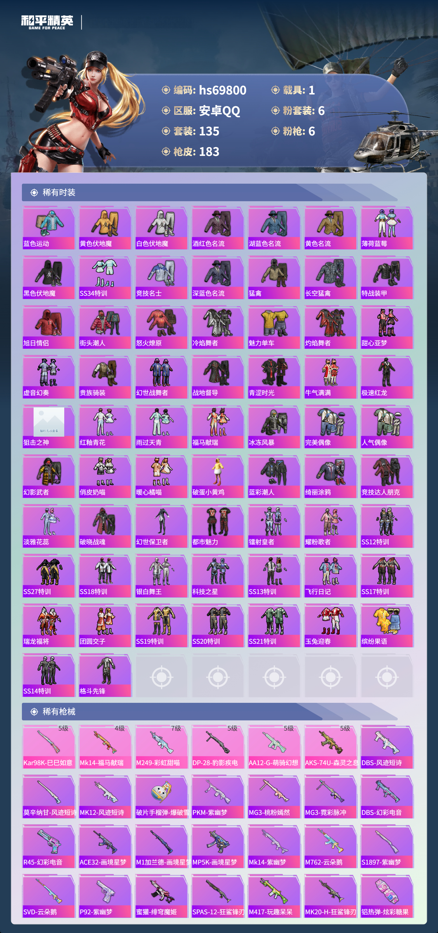 hs69800 安卓手Q-7王牌印记-6粉装-6特效枪-1载具-54314热力值-135套装-183枪皮-3卓越印记-1传奇印记