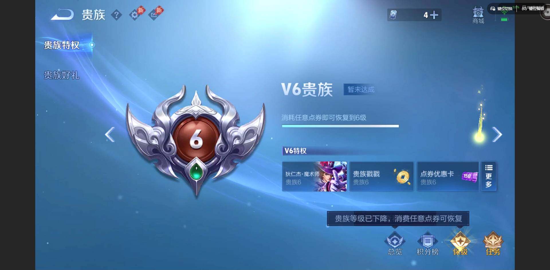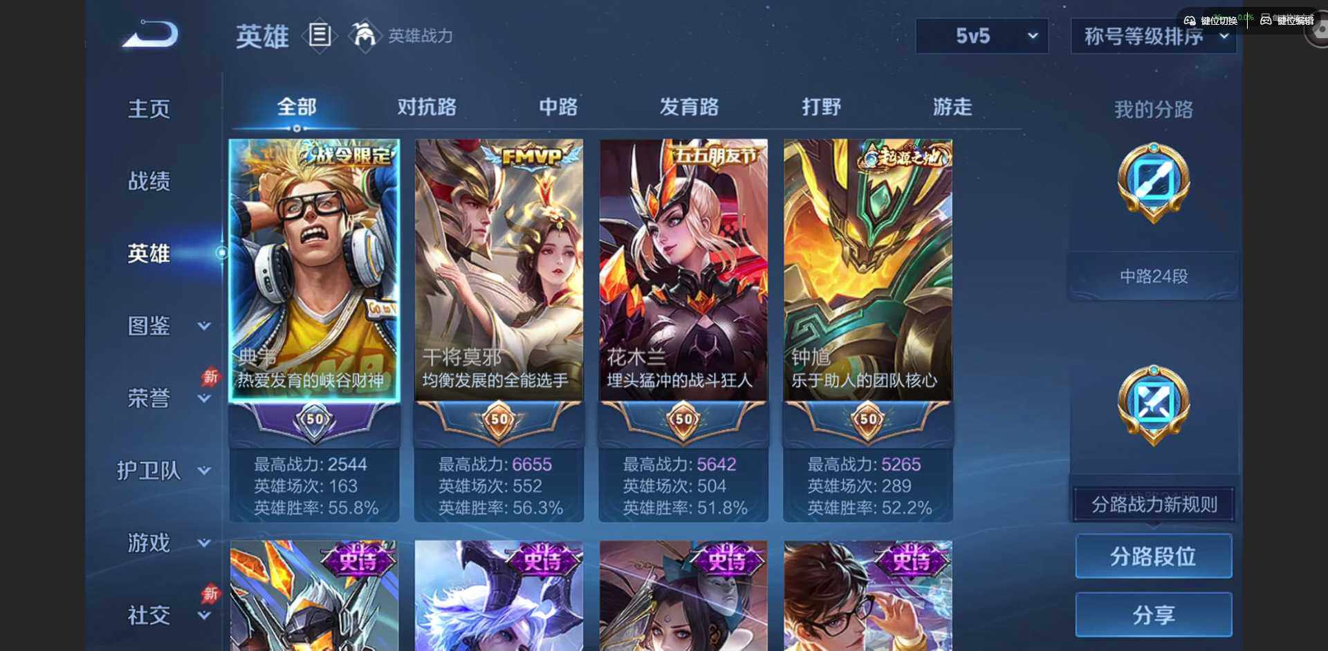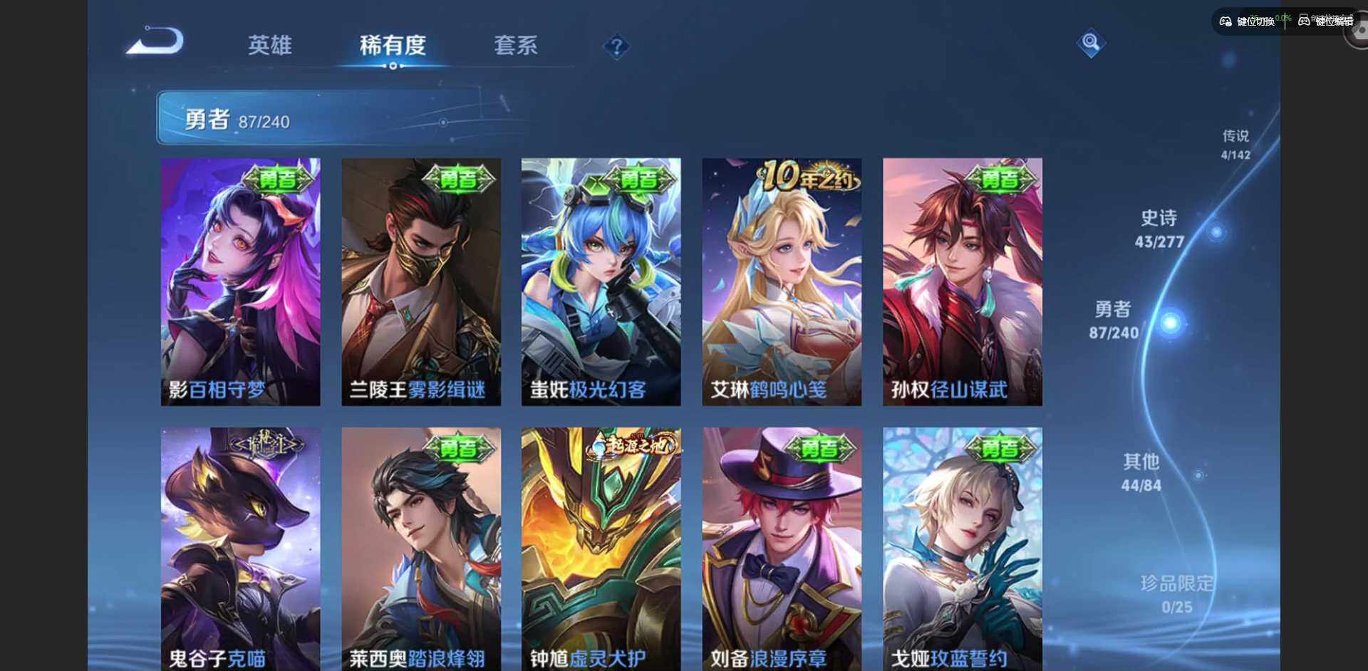 实名: 可修改 贵族等级: V6 英雄数: 127 皮肤数: 179 荣耀水晶