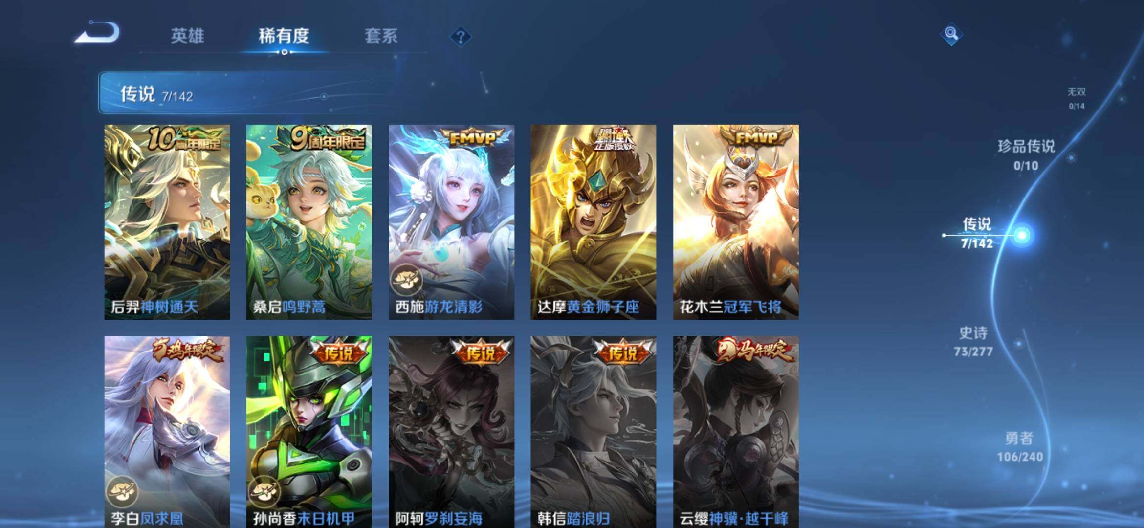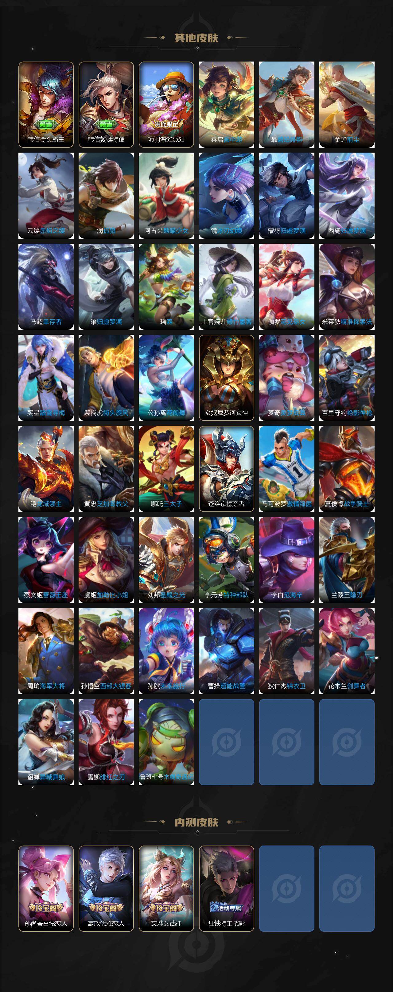 【传说皮肤】:后羿神树通天,桑启鸣野蒿,西施游龙清影,达摩黄金狮子座,花木兰冠军飞将,李白凤求凰,孙尚香末日机甲
