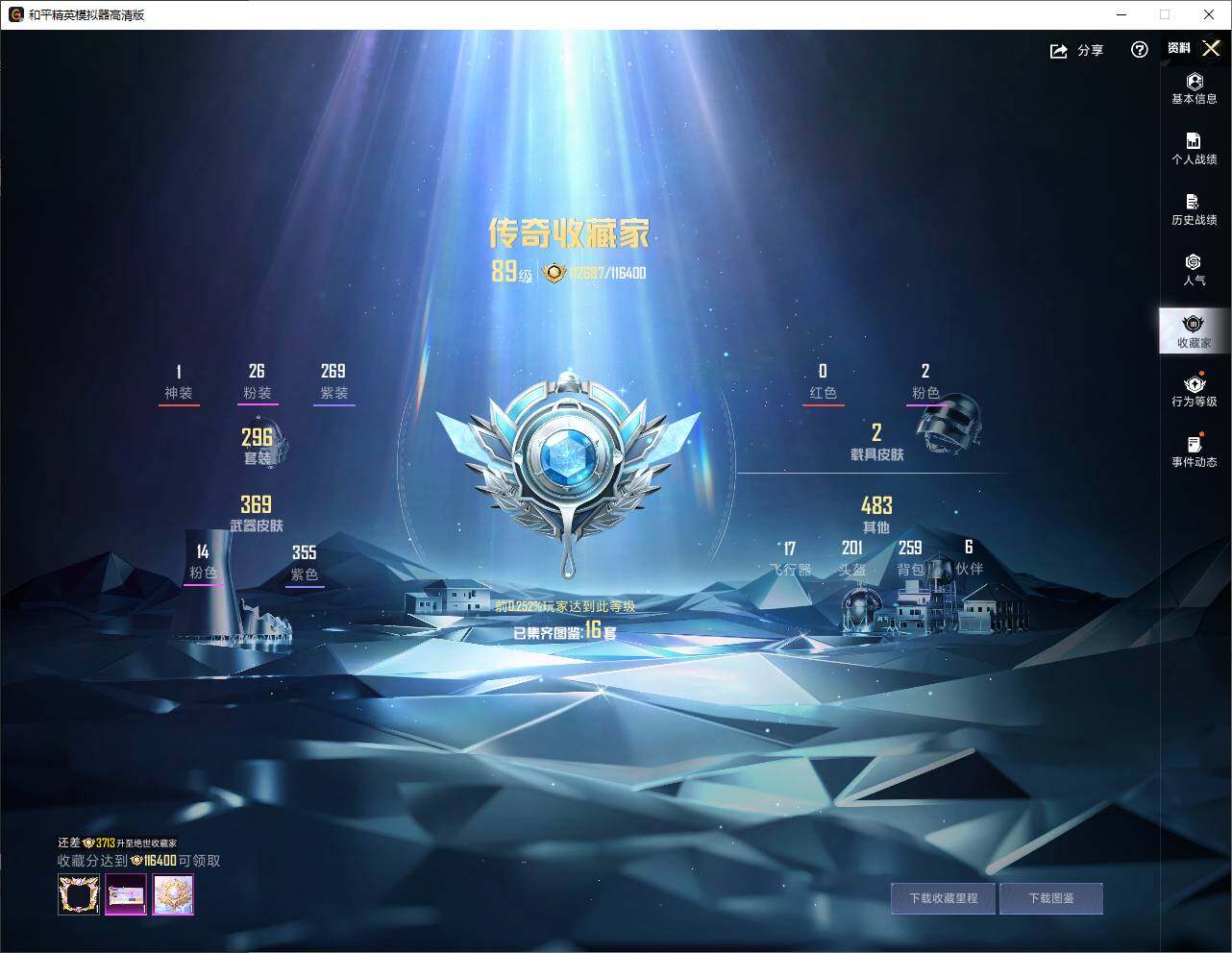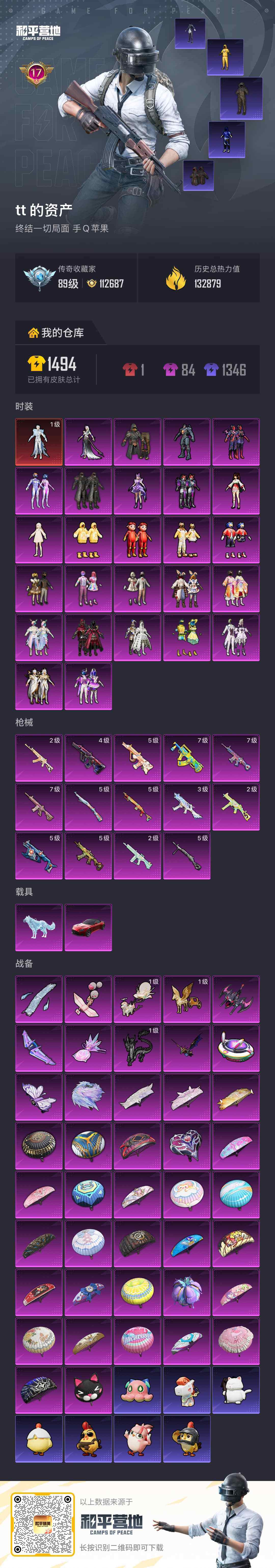 苹果 手Q-1神装-26粉装-14特效枪-2载具-11粉色飞行器-132879热力值-17王牌印记-296套装-395枪皮