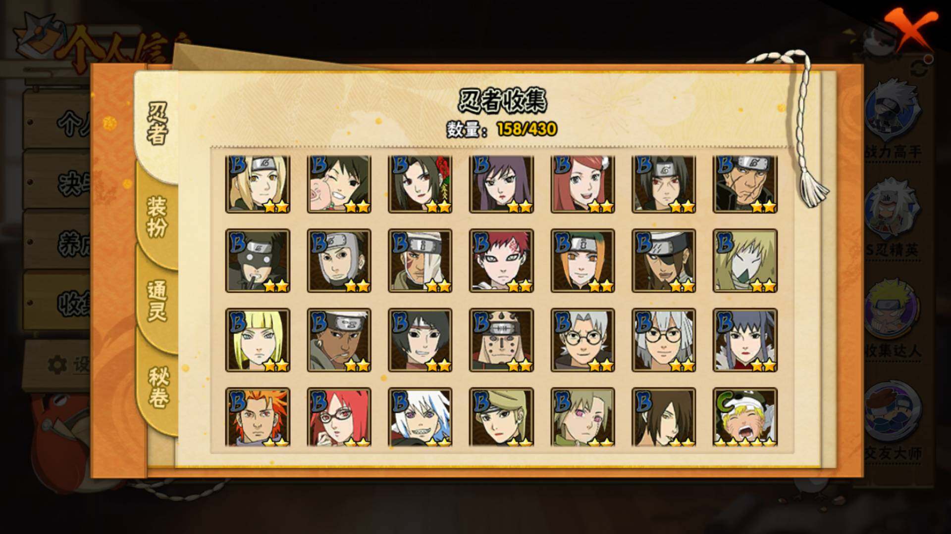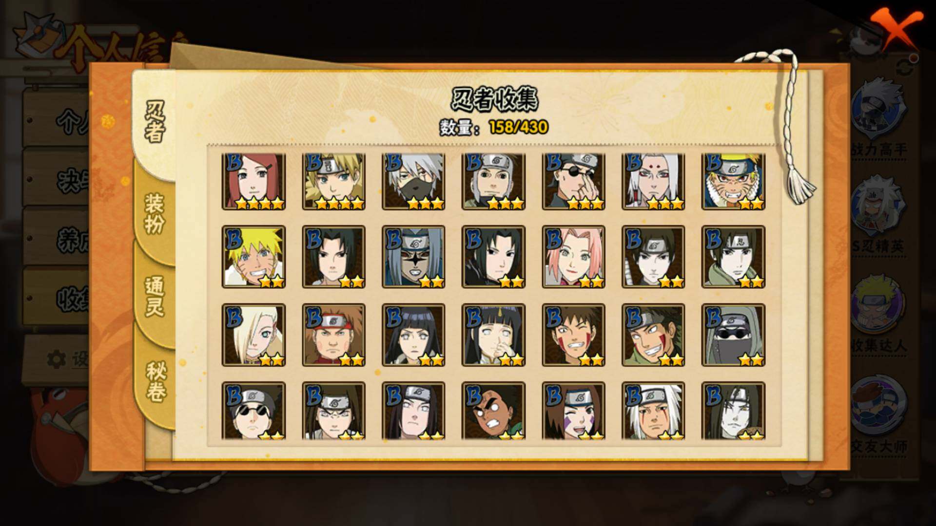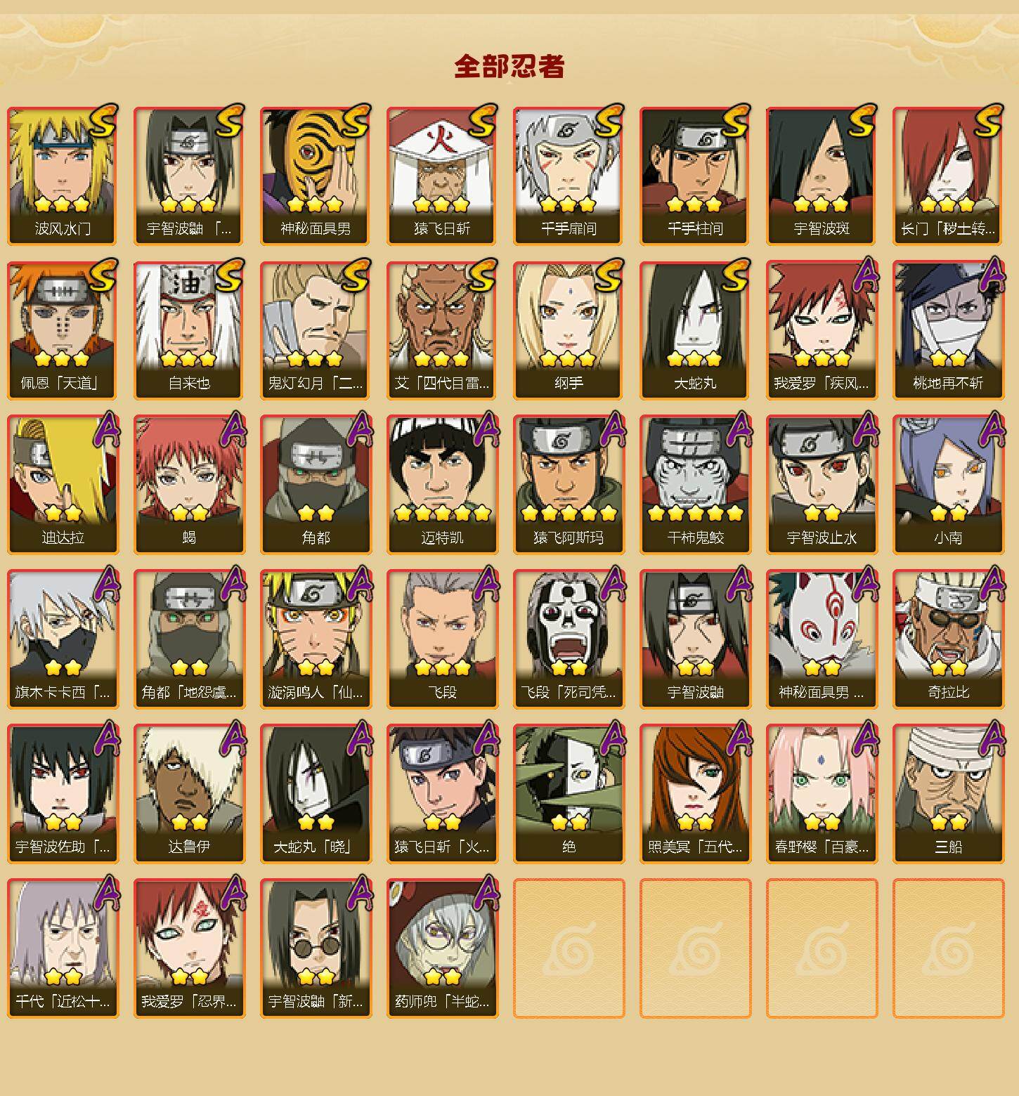 【S级忍者】:长门「秽土转生」(3星),宇智波鼬「须佐能乎」(3星),艾「四代目雷影」(3星),鬼灯幻月「二代目水影」(3星),自来也(3星),大蛇丸(3星),纲手(3星),千手柱间(3星),千手扉间(3星),猿飞日斩(3星),宇智波斑(3星),波风水门(3星),神秘面具男(3星),佩恩「天道」(3星)