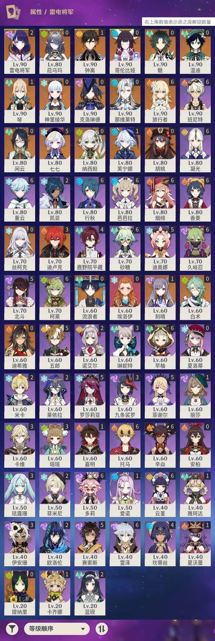 0命克洛琳德,0命闲云,1命芙宁娜,0命那维莱特,0命白术,0命迪希雅,0命流浪者,0命纳西妲,0命提纳里,2命雷电将军,0命神里绫华,1命钟离,0命胡桃,0命魈,0命温迪,1命刻晴,5命七七,1命琴,3命迪卢克,0命丝柯克,0命菈乌玛,0命哥伦比娅,精1赦罪,精1千夜浮梦,精1波乱月白经津,精1薙草之稻光,精2四风原典,精2和璞鸢,精2天空