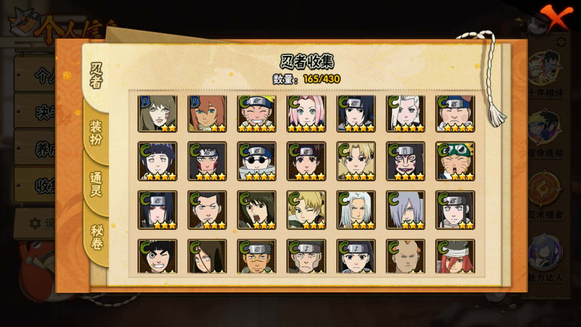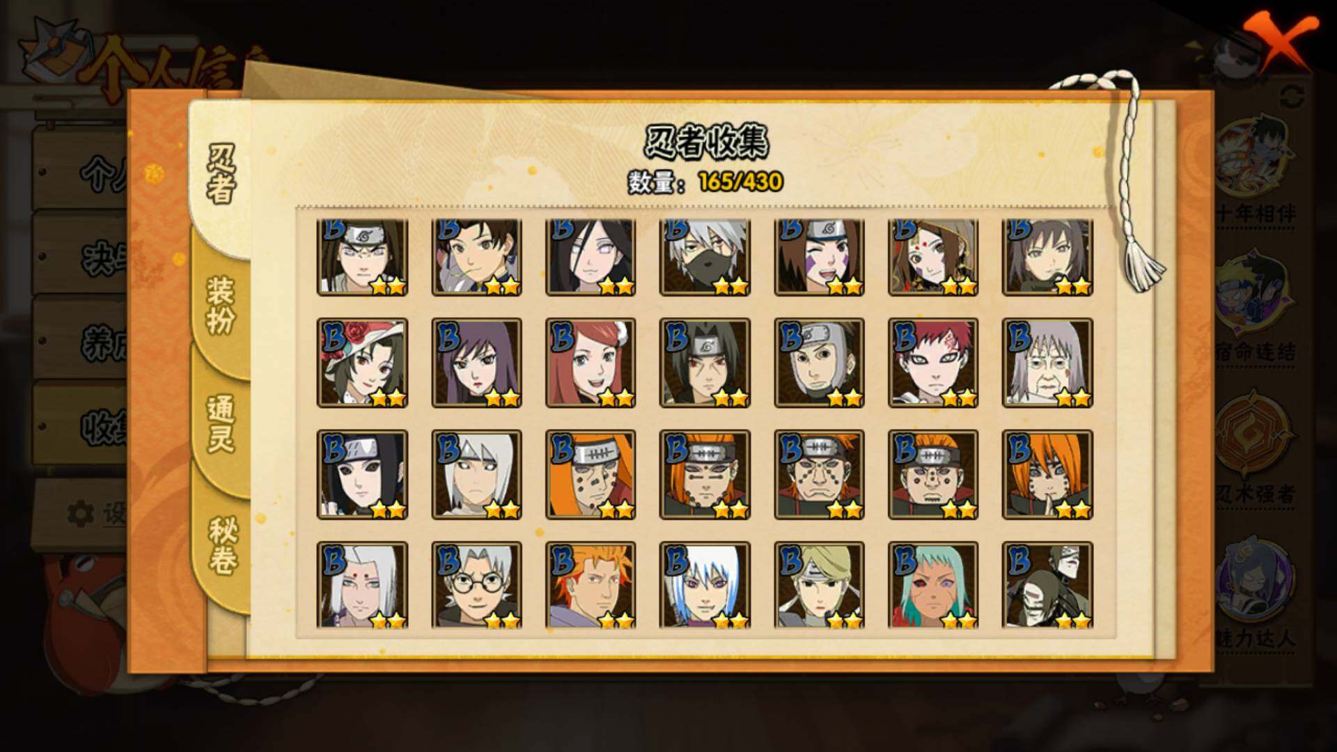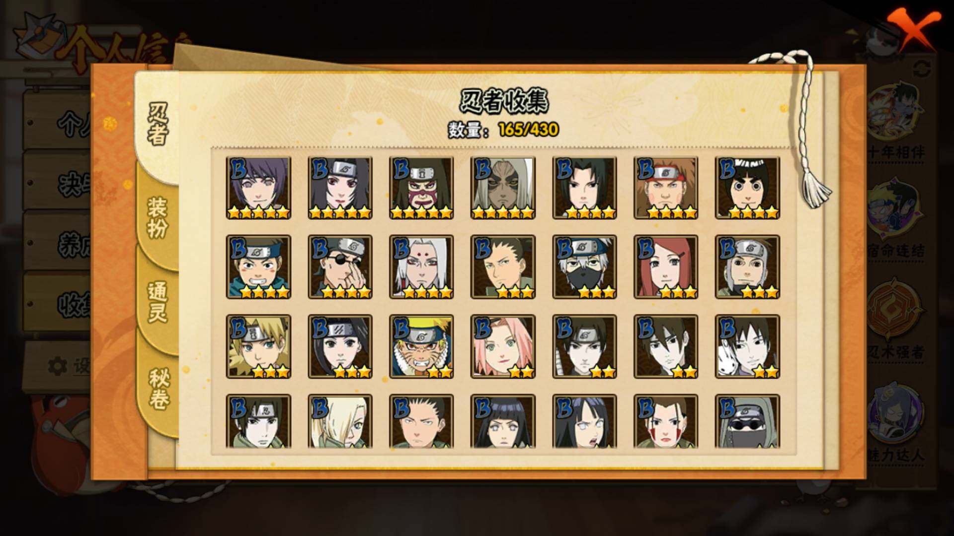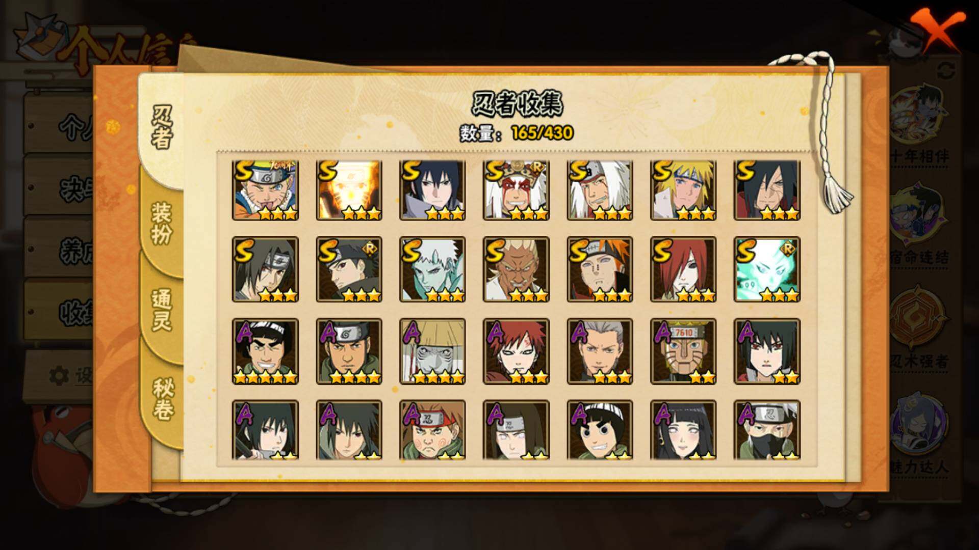 【S级忍者】:长门「秽土转生」(3星),宇智波斑「秽土转生·解」(3星),艾「忍界大战」(3星),宇智波鼬「须佐能乎」(3星),宇智波止水「须佐能乎」(3星),自来也「舞之豪杰」(3星),自来也「传说中的三忍」(3星),波风水门(3星),漩涡鸣人「九喇嘛连结」(3星),佩恩「