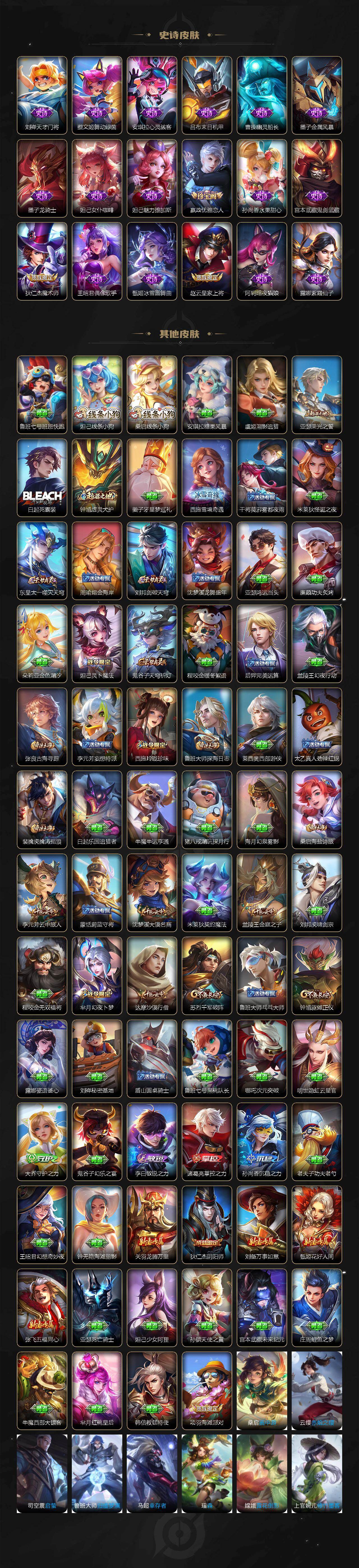 【限定皮肤】:狄仁杰阴阳师,赵云皇家上将,妲己时之彼端,嬴政优雅恋人,芈月幻夜卜梦,元歌无心,狄仁杰魔术师,达摩沙漠行僧,项羽海滩派对,兰陵王金庭之子,李元芳云中旅人,钟馗驱