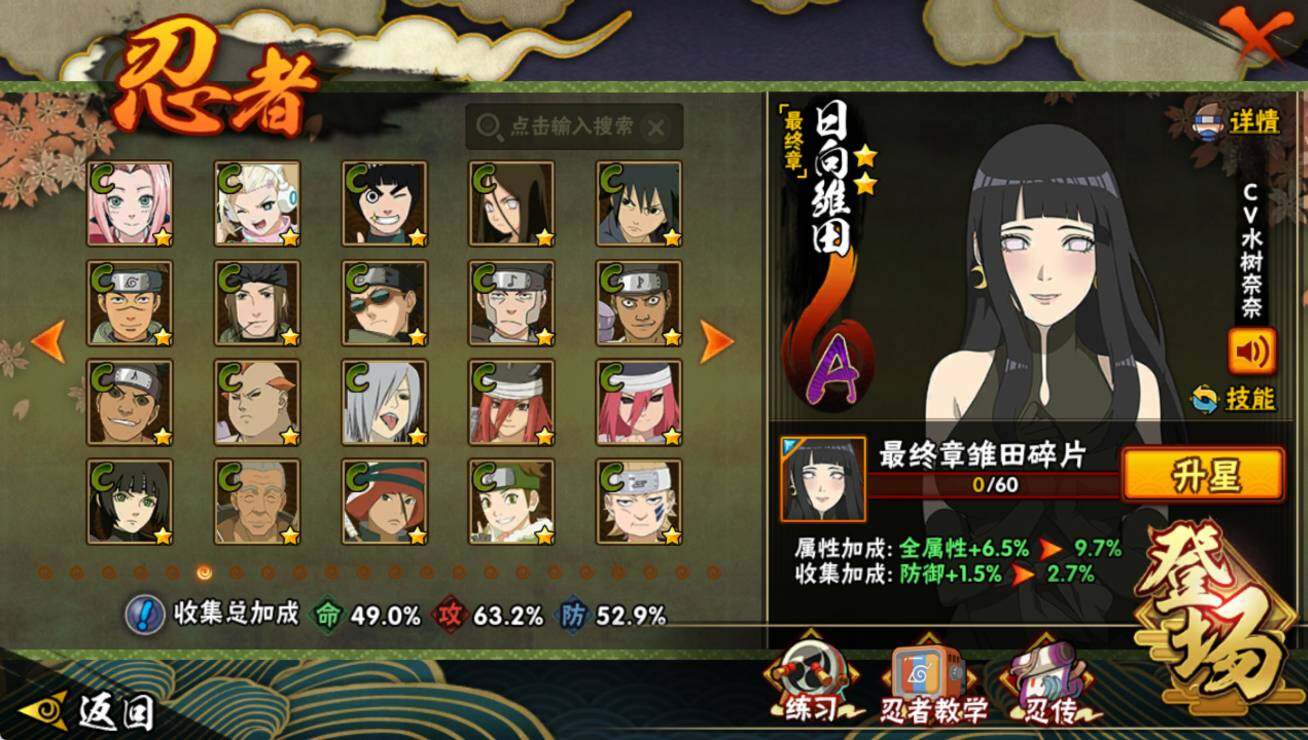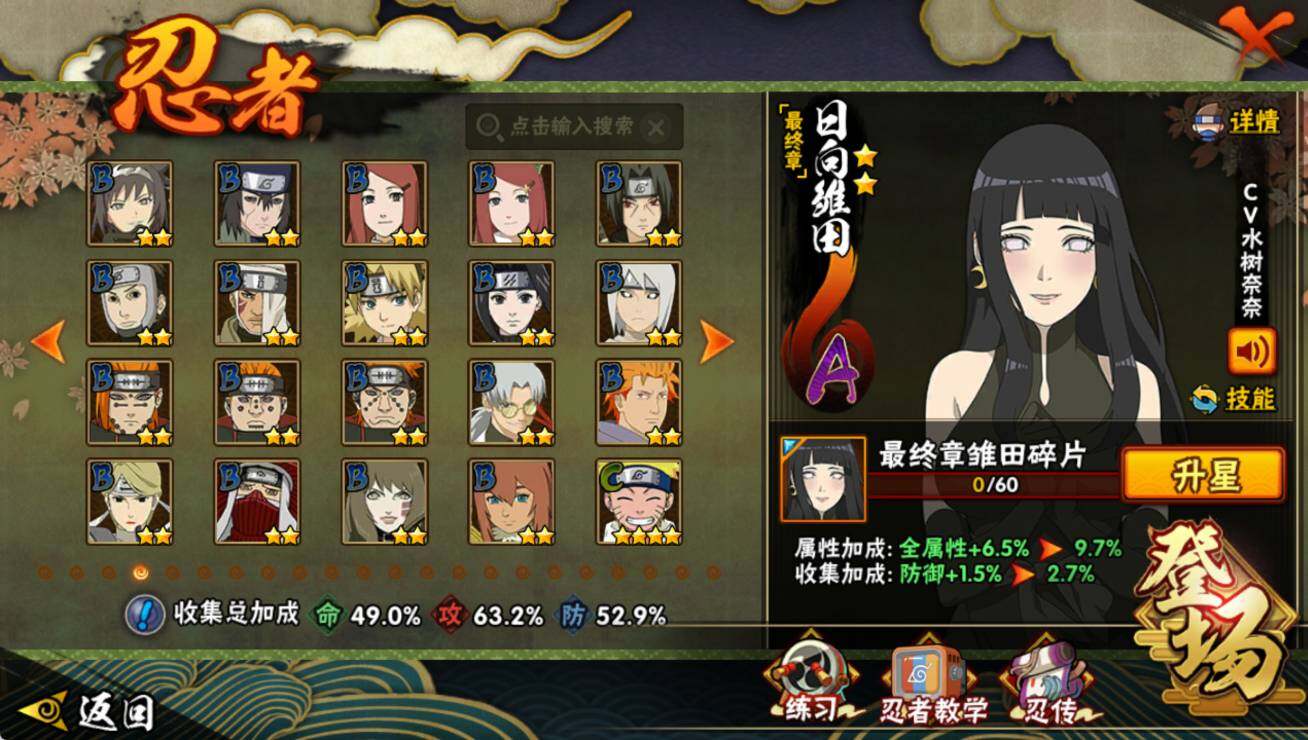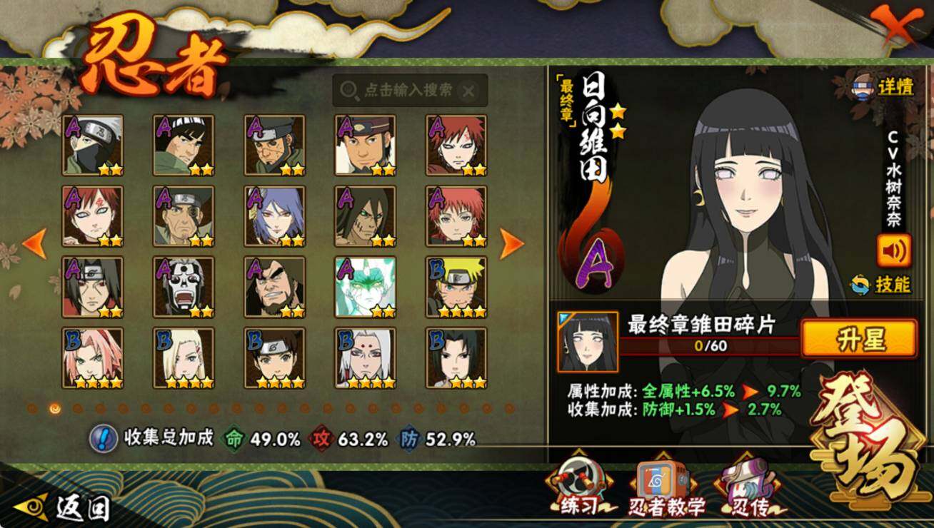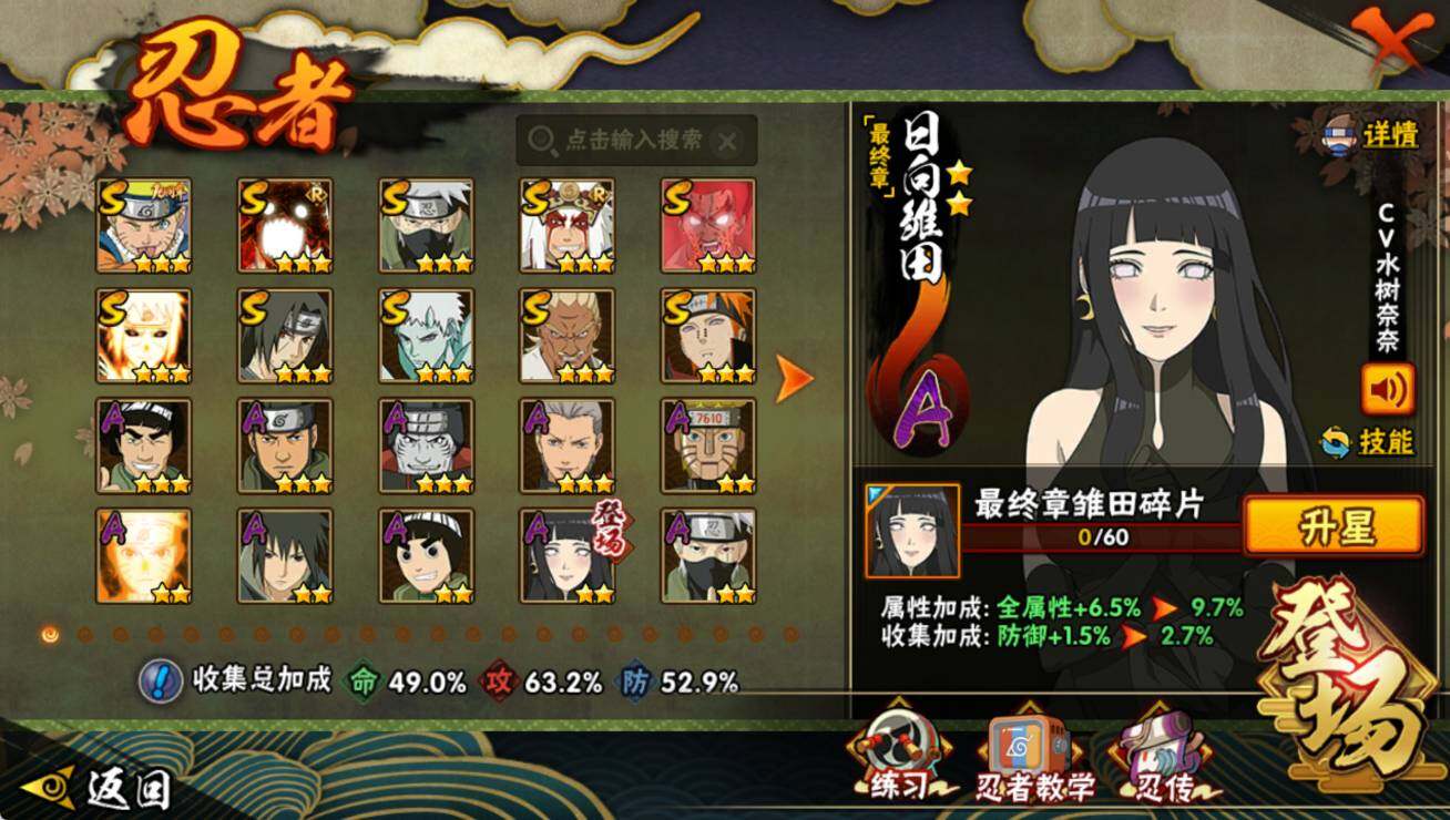【S级忍者】:艾「忍界大战」(3星),宇智波鼬「须佐能乎」(3星),旗木卡卡西「须佐能乎」(3星),自来也「舞之豪杰」(3星),迈特凯「死门」(3星),佩恩「天道」(3星),漩涡鸣人「暴怒·第六尾」(3星),波风水门「九喇嘛连结」(3星),漩涡鸣人·宇智波佐助(3星),宇智波带土「十尾人柱力」(3星)