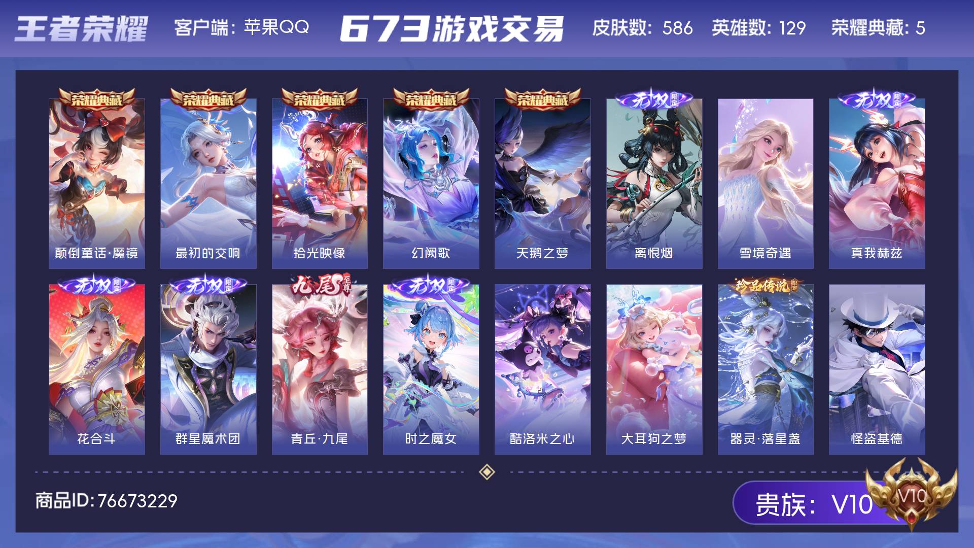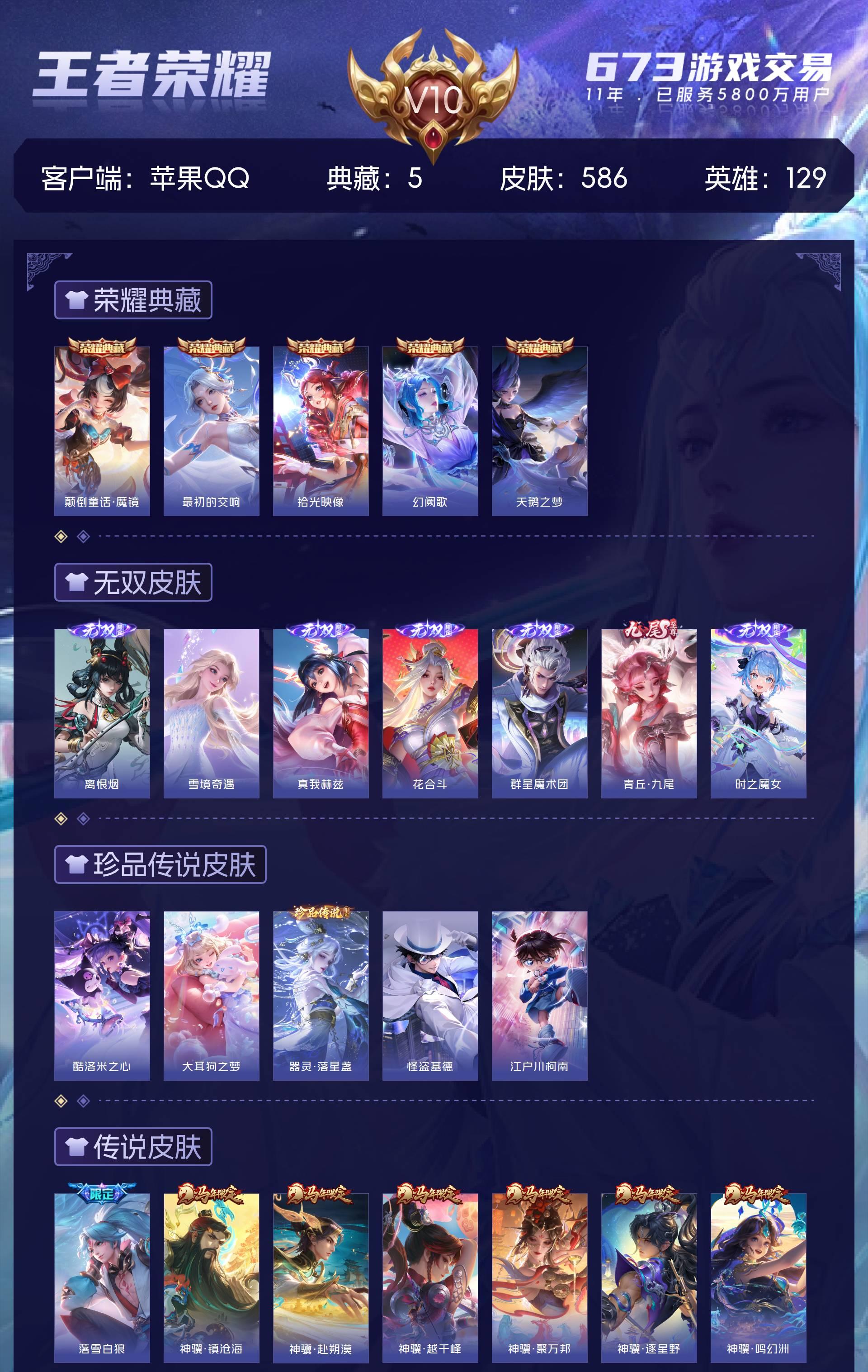 V10 皮肤586 英雄129 永恒钻石 荣耀典藏5 无双皮肤7 珍品传说5 传说100