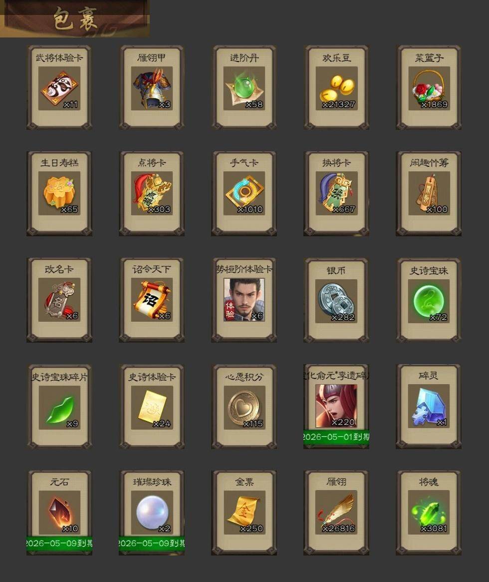 【JYSGS293】官阶:先锋及以下 VIP等级:VIP1级 史诗武将数:0 动态皮肤数:1 武将总数:109 史诗宝珠数:72 元宝数:0 将魂数:3081 /界曹操/界夏侯惇/界张辽/界郭嘉/界夏侯渊/曹冲/曹真/韩浩史涣/界郭淮/辛宪英/曹昂/SP关羽/SP姜维/文聘/朱灵/骥李典/华雄/袁术/界华佗/界袁术/界颜良文丑/公孙瓒/蔡夫人/界公孙瓒/曹节/界赵云/关兴张苞/廖化/关平/吴懿/