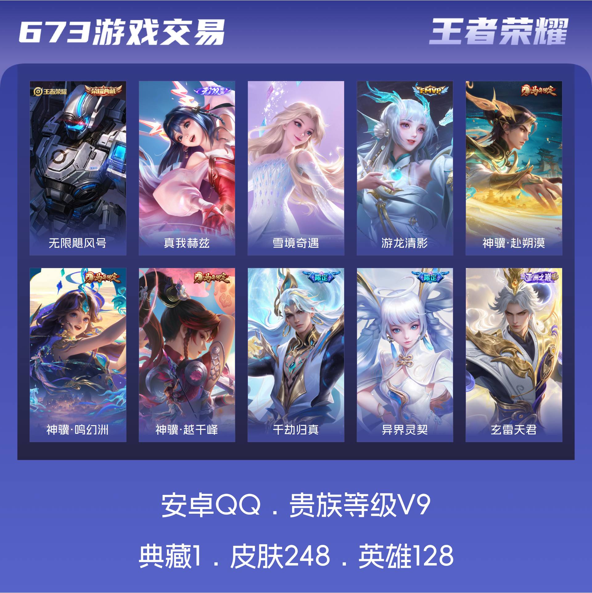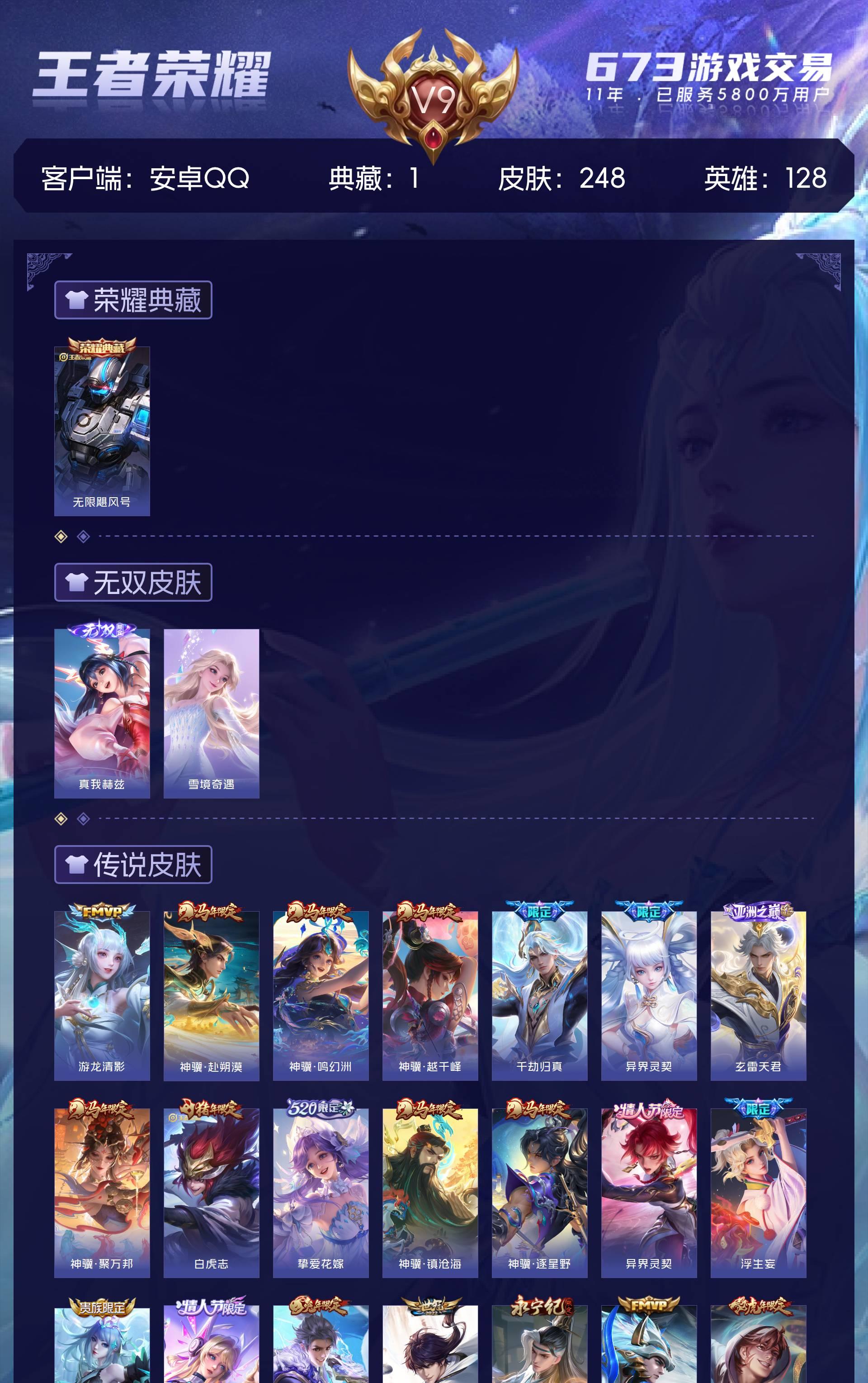 V9 皮肤248 英雄128 至尊星耀 荣耀典藏1 无双皮肤2 传说26