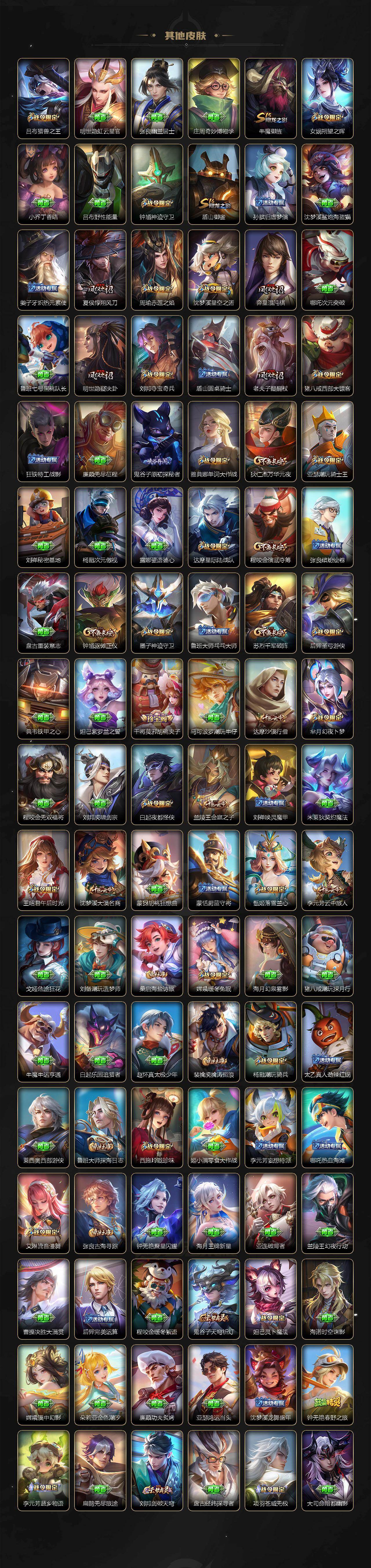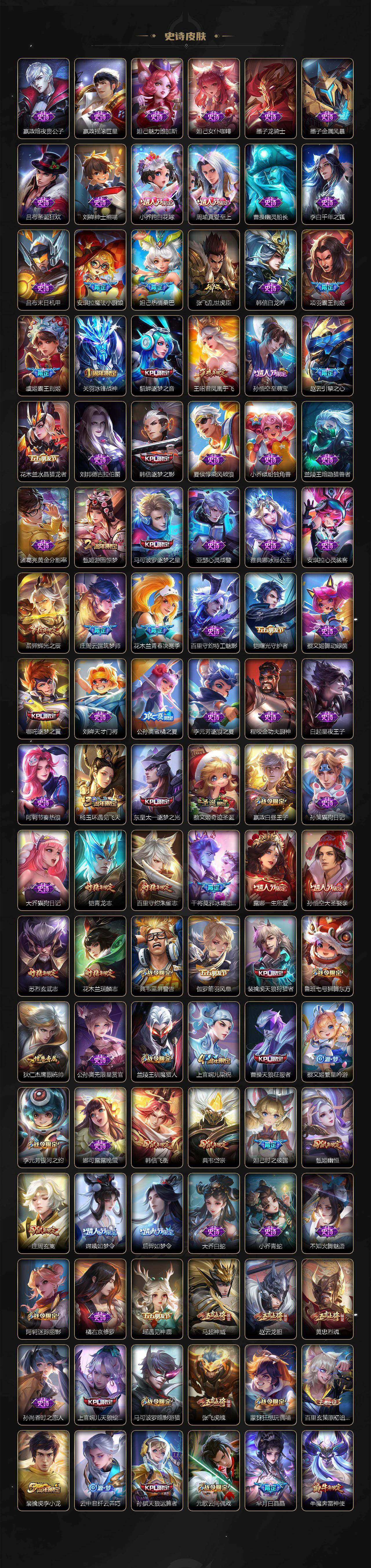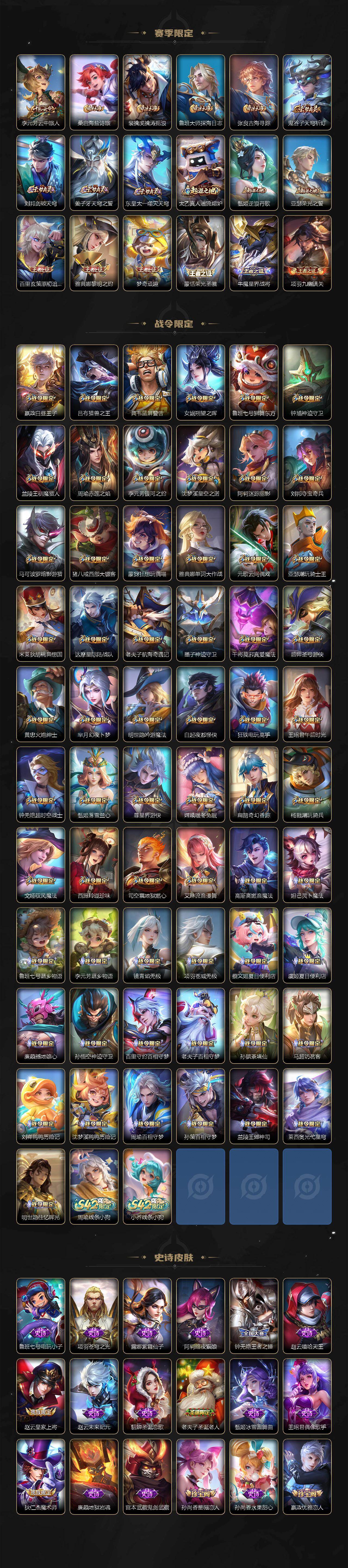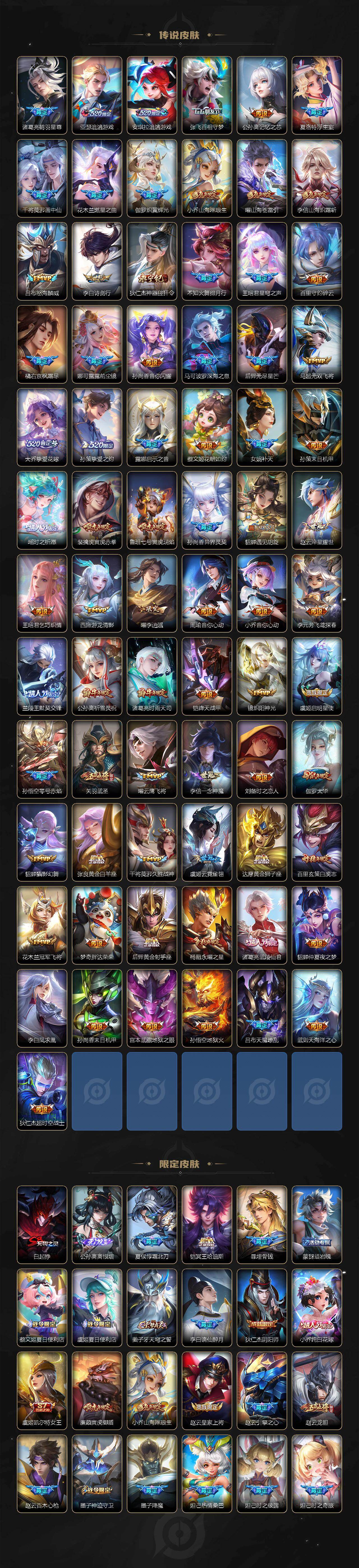 【英雄全皮】:廉颇全皮,赵云全皮,墨子全皮,嬴政全皮,鲁班七号全皮,钟无艳全皮,孙膑全皮,扁鹊全皮,白起全皮,周瑜全皮,元歌全皮,甄姬全皮,典韦全皮,宫本武藏全皮,李白全皮,马可波罗全皮,达摩全皮,武则天全皮,司马懿全皮,老夫子全皮,露