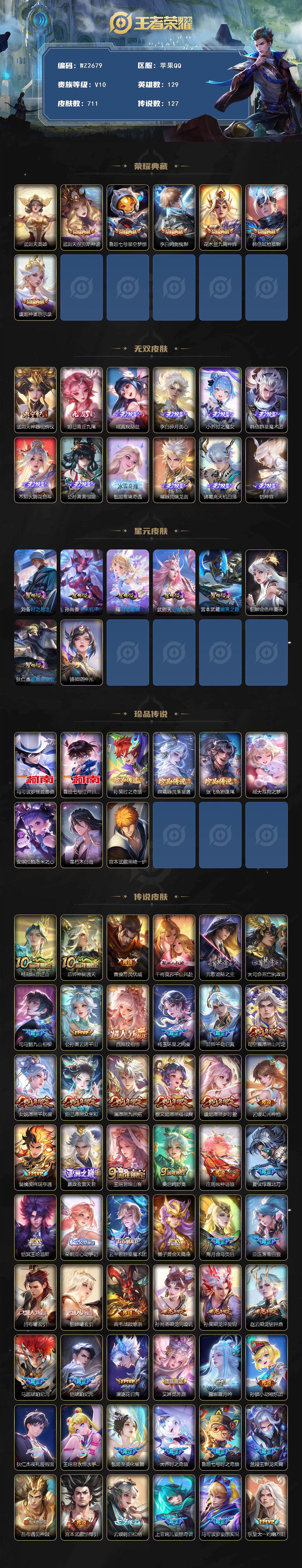【秒换绑】苹果Q-V10-最强王者段位-129英雄-711皮肤-6典藏皮肤-1典藏英雄-12无双-9珍品传说-127传说-258史诗