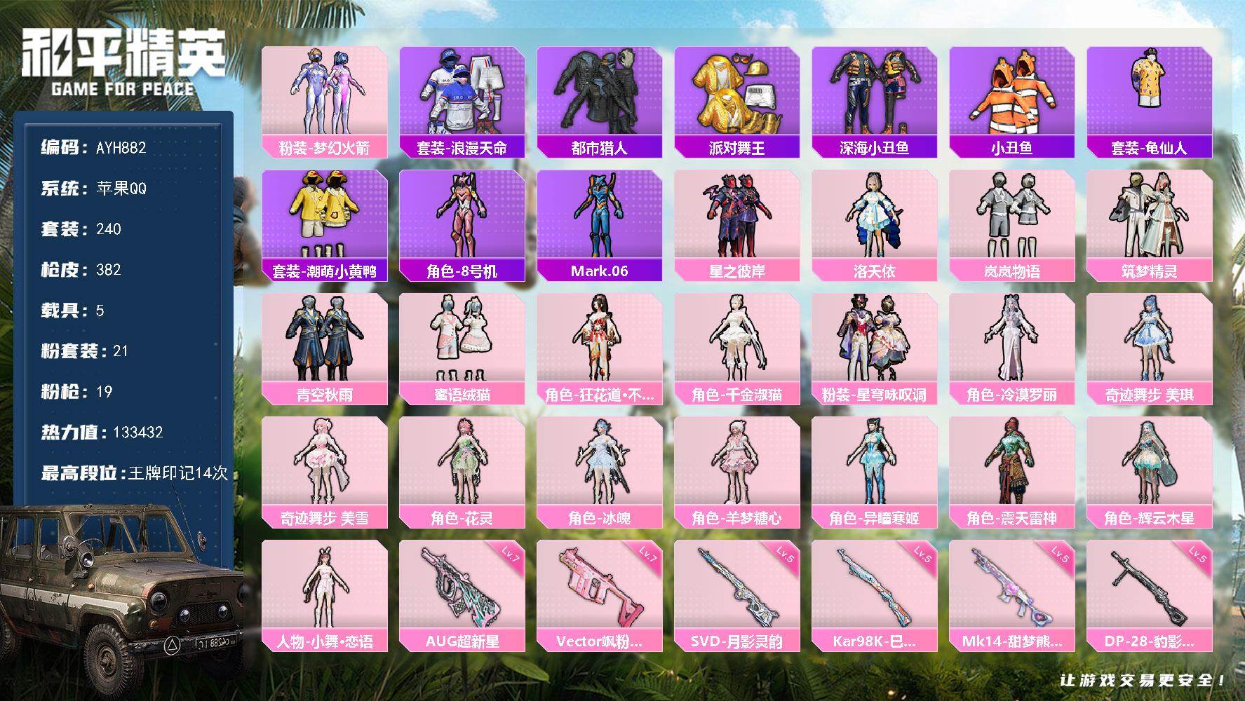 【双字id鏇魅/金鞋/都市/101】苹果 手Q-21粉装-19特效枪-5载具-14粉色飞行器-133432热力值-14王牌印记-240套装-382枪皮【热门品类】:粉装-梦幻火箭,套装-浪漫天命,套装-都市猎人,套装-派对舞王,套装-深海小丑鱼,套装-小丑鱼,套装-龟仙人,套装-潮萌小黄鸭,角色-8号机,角色-Mark.06【粉色套装】:粉装-梦幻火箭,粉装-星之彼岸,角色-洛天依,粉装-岚岚物语,粉装-筑梦精灵,粉装-青空秋雨,粉装-蜜语绒猫,角色-狂花道·不知火舞,角色-千金淑猫,粉装-星穹